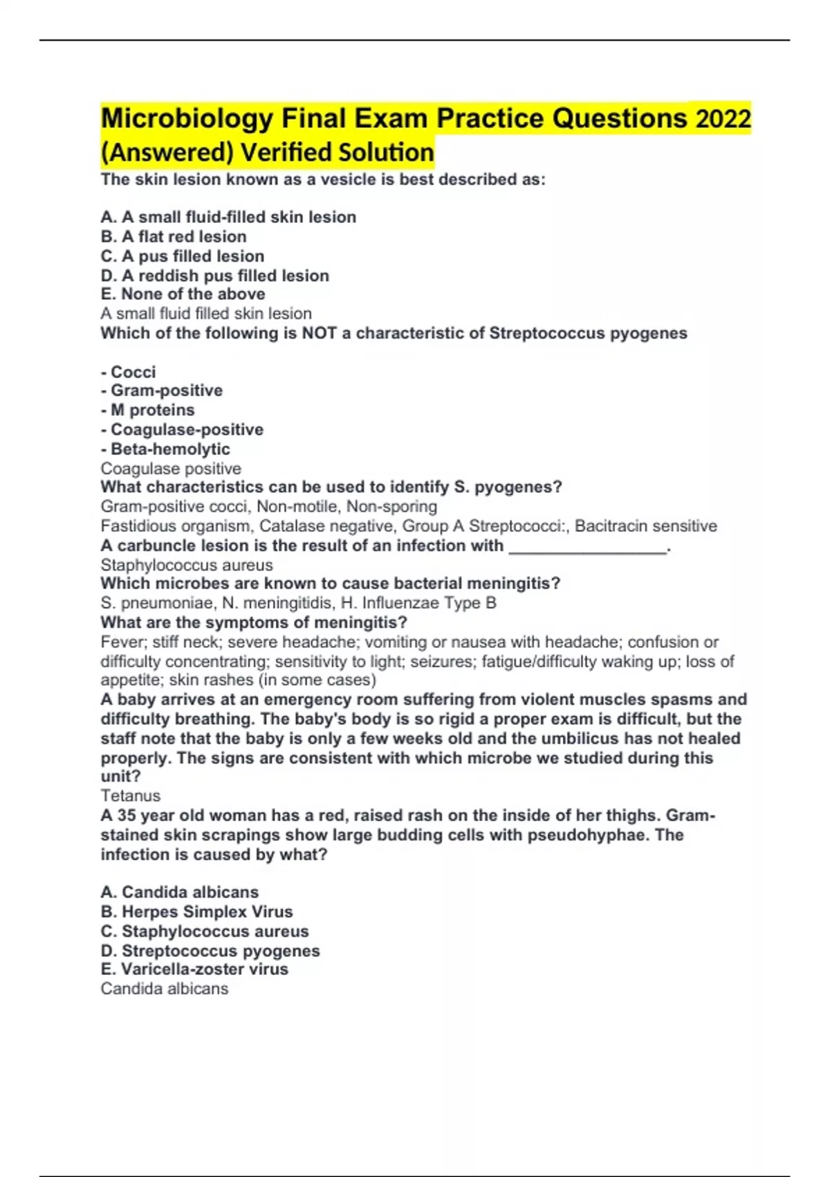 Microbiology Final Exam Practice Questions 2022 (Answered) Verified Solution The skin lesion known as a vesicle is best described as: A. A small fluid-filled skin lesion B. A flat red lesion C. A pus filled lesion D. A reddish pus filled lesion E. None of the above A small fluid filled skin lesion Which of the following is NOT a characteristic of Streptococcus pyogenes - Cocci - Gram-positive - M proteins - Coagulase-positive - Beta-hemolytic Coagulase positive What characteristics can be used to identify S. pyogenes? Gram-positive cocci, Non-motile, Non-sporing Fastidious organism, Catalase negative, Group A Streptococci:, Bacitracin sensitive A carbuncle lesion is the result of an infection with _________________. Staphylococcus aureus Which microbes are known to cause bacterial meningitis? S. pneumoniae, N. meningitidis, H. Influenzae Type B What are the symptoms of meningitis? Fever; stiff neck; severe headache; vomiting or nausea with headache; confusion or difficulty concentrating; sensitivity to light; seizures; fatigue/difficulty waking up; loss of appetite; skin rashes (in some cases) A baby arrives at an emergency room suffering from violent muscles spasms and difficulty breathing. The baby's body is so rigid a proper exam is difficult, but the staff note that the baby is only a few weeks old and the umbilicus has not healed properly. The signs are consistent with which microbe we studied during this unit? Tetanus A 35 year old woman has a red, raised rash on the inside of her thighs. Gram-stained skin scrapings show large budding cells with pseudohyphae. The infection is caused by what? A. Candida albicans B. Herpes Simplex Virus C. Staphylococcus aureus D. Streptococcus pyogenes E. Varicella-zoster virus Candida albicans