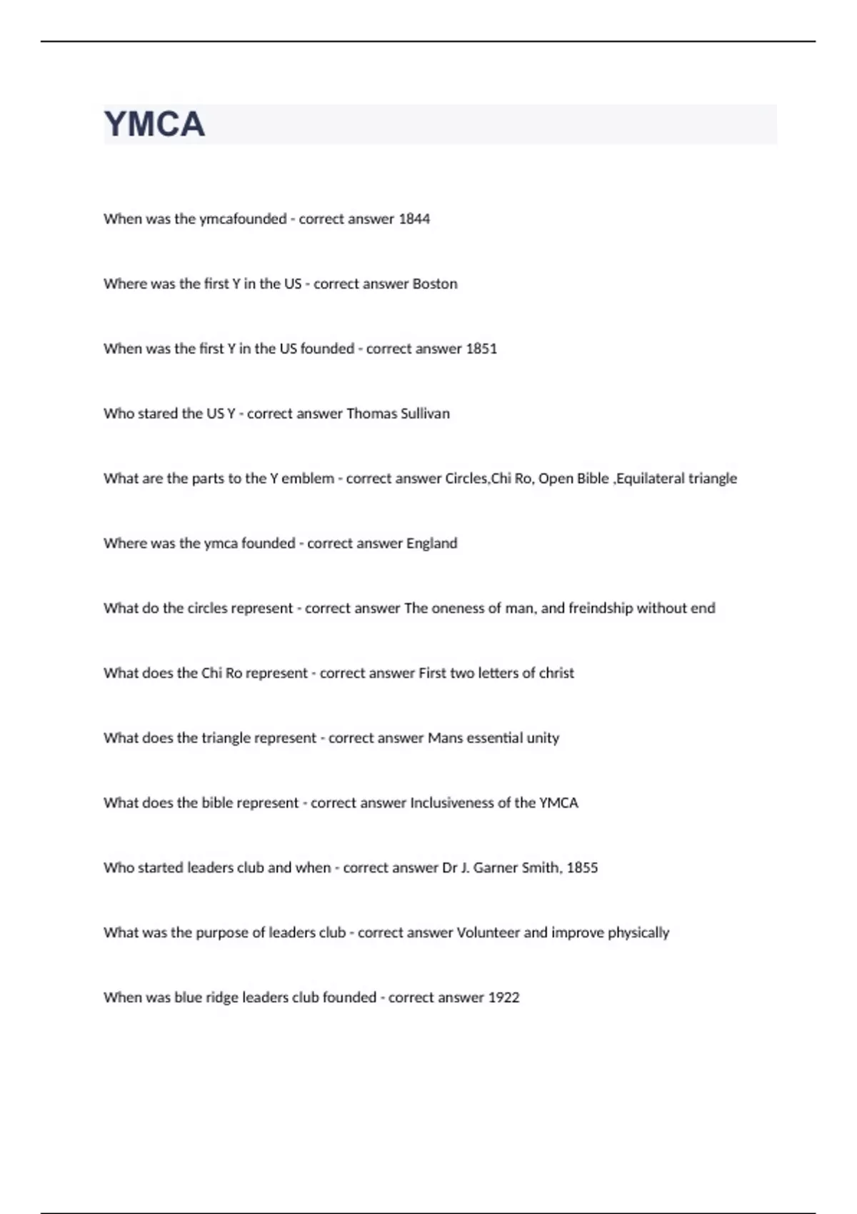 YMCA When was the ymcafounded - correct answer 1844 Where was the first Y in the US - correct answer Boston When was the first Y in the US founded - correct answer 1851 Who stared the US Y - correct answer Thomas Sullivan What are the parts to the Y emblem - correct answer Circles,Chi Ro, Open Bible ,Equilateral triangle Where was the ymca founded - correct answer England What do the circles represent - correct answer The oneness of man, and freindship without end What does the Chi Ro represent - correct answer First two letters of christ What does the triangle represent - correct answer Mans essential unity What does the bible represent - correct answer Inclusiveness of the YMCA Who started leaders club and when - correct answer Dr J. Garner Smith, 1855 What was the purpose of leaders club - correct answer Volunteer and improve physically When was blue ridge leaders club founded - correct answer 1922 What does red represent - correct answer Caring What does yellow represent - correct answer Respect What does green represent - correct answer Responsibility What does blue represent - correct answer Honesty What does purple represent - correct answer Faith What is the YMCA mission statement - correct answer To put Christian principles into practice through programs to build a healthy,spirit ,body ,and mind for all What are the basic needs - correct answer Success and approval Physical ability Contest Acceptance Adventure know Elements of teaching - correct answer Tell,show,do,check Who invented basketball - correct answer James Naismith What year was basketball invented and where - correct answer 1891, Springfield Massachusetts Who invented volleyball - correct answer William Morgan