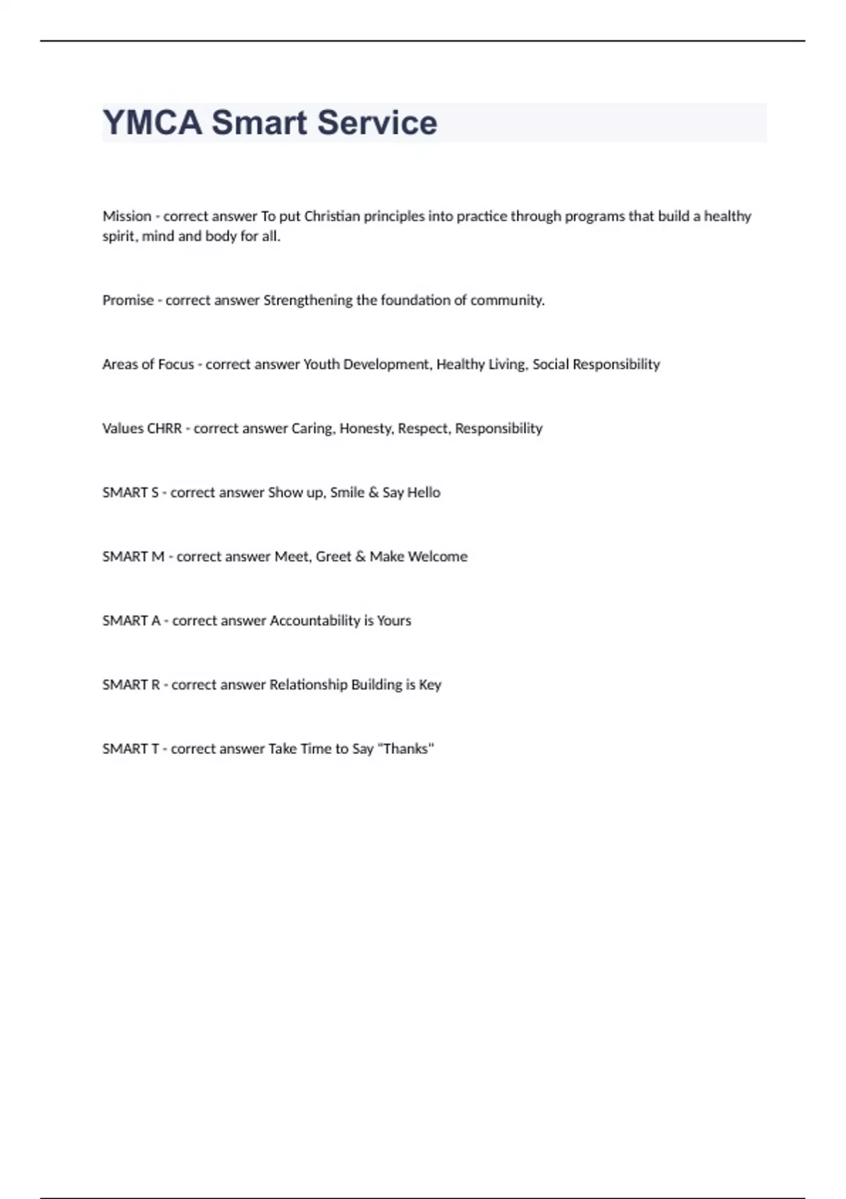 YMCA Smart Service Mission - correct answer To put Christian principles into practice through programs that build a healthy spirit, mind and body for all. Promise - correct answer Strengthening the foundation of community. Areas of Focus - correct answer Youth Development, Healthy Living, Social Responsibility Values CHRR - correct answer Caring, Honesty, Respect, Responsibility SMART S - correct answer Show up, Smile & Say Hello SMART M - correct answer Meet, Greet & Make Welcome SMART A - correct answer Accountability is Yours SMART R - correct answer Relationship Building is Key SMART T - correct answer Take Time to Say "Thanks"