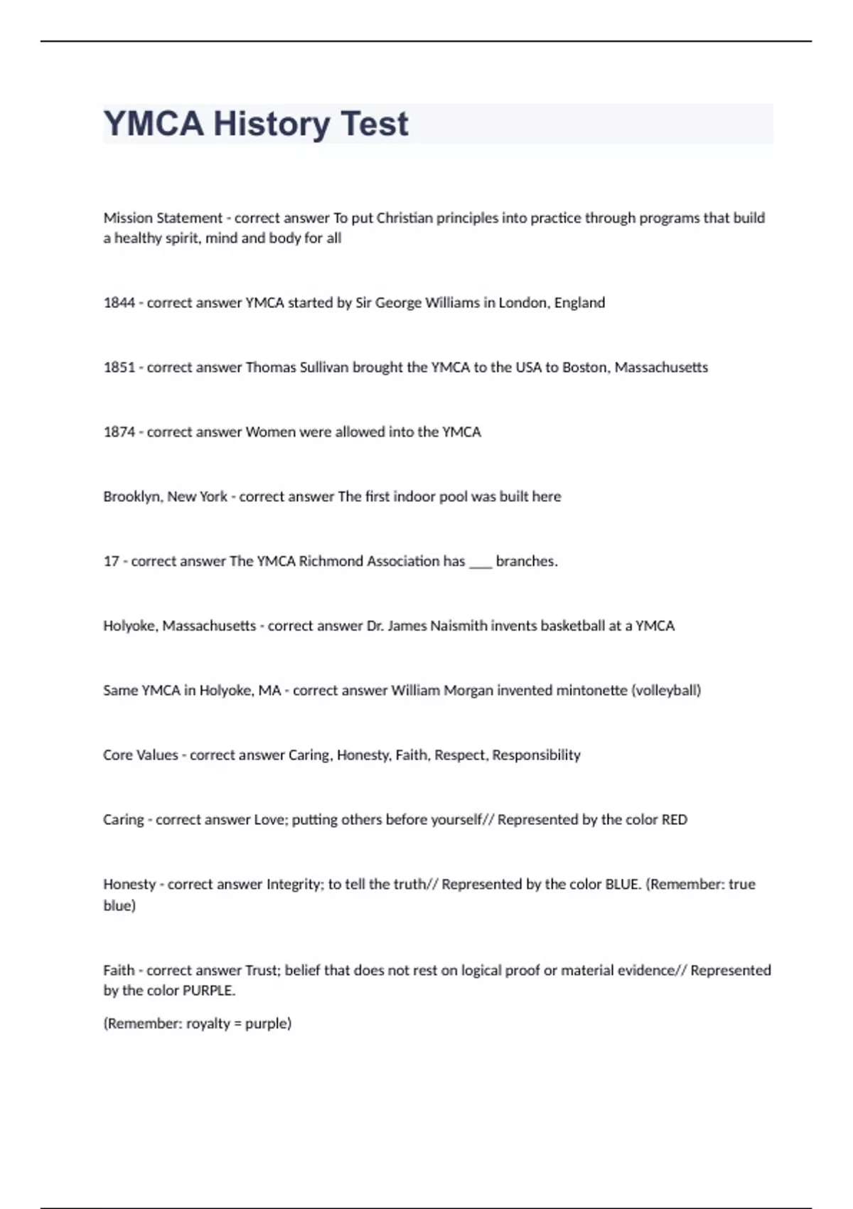 YMCA History Test.Mission Statement - correct answer To put Christian principles into practice through programs that build a healthy spirit, mind and body for all 1844 - correct answer YMCA started by Sir George Williams in London, England 1851 - correct answer Thomas Sullivan brought the YMCA to the USA to Boston, Massachusetts 1874 - correct answer Women were allowed into the YMCA Brooklyn, New York - correct answer The first indoor pool was built here 17 - correct answer The YMCA Richmond Association has ___ branches. Holyoke, Massachusetts - correct answer Dr. James Naismith invents basketball at a YMCA Same YMCA in Holyoke, MA - correct answer William Morgan invented mintonette (volleyball) Core Values - correct answer Caring, Honesty, Faith, Respect, Responsibility Caring - correct answer Love; putting others before yourself// Represented by the color RED Honesty - correct answer Integrity; to tell the truth// Represented by the color BLUE. (Remember: true blue) Faith - correct answer Trust; belief that does not rest on logical proof or material evidence// Represented by the color PURPLE. (Remember: royalty = purple) Respect - correct answer To treat others as you would have them treat you// Represented by the color YELLOW. Responsibility - correct answer Duty; to do what you say you will do// Represented by the color GREEN Focus Areas - correct answer For Youth Development// For Healthy Living// For Social Responsibility Rebranding - correct answer the Y symbol was rebranded in 2010 #1 RULE - correct answer Never be alone with a child. Always be in eyesight of a staff member or volunteer 3 children - correct answer How many children should you take somewhere, so you are not alone with them. e.g. going to the restroom What are volunteers not permitted to do with the children - correct answer Hugs, sit-hugs, and lap sitting are not permitted. If you must, do a side hug. YMCA stands for - correct answer Young Men's Christian Association The YMCA is a non-profit organization, which means - correct answer All income goes back into the YMCA and our community.