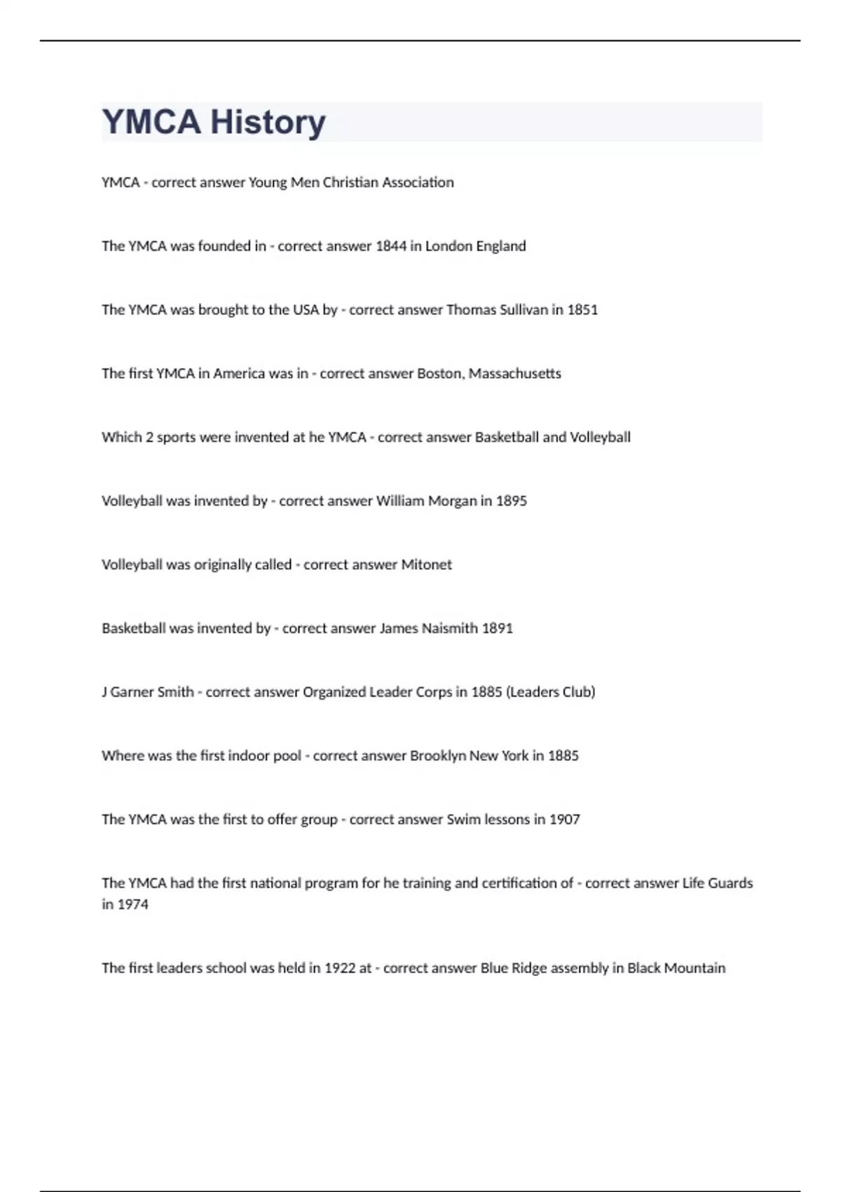 YMCA HistoryYMCA - correct answer Young Men Christian Association The YMCA was founded in - correct answer 1844 in London England The YMCA was brought to the USA by - correct answer Thomas Sullivan in 1851 The first YMCA in America was in - correct answer Boston, Massachusetts Which 2 sports were invented at he YMCA - correct answer Basketball and Volleyball Volleyball was invented by - correct answer William Morgan in 1895 Volleyball was originally called - correct answer Mitonet Basketball was invented by - correct answer James Naismith 1891 J Garner Smith - correct answer Organized Leader Corps in 1885 (Leaders Club) Where was the first indoor pool - correct answer Brooklyn New York in 1885 The YMCA was the first to offer group - correct answer Swim lessons in 1907 The YMCA had the first national program for he training and certification of - correct answer Life Guards in 1974 The first leaders school was held in 1922 at - correct answer Blue Ridge assembly in Black Mountain The first year Siskey attended BRLS was - correct answer 2006 BRLS six directors are/were - correct answer Ira Matheny, Paul Grist, Colquitt Clark, Tom Thrailkill, Kevin Dean, Steve Tarver Fitness Standards for guys - correct answer 24 push-ups, 44 sit-ups in a minute, and a 10.1 second shuttle run Fitness Standards for girls - correct answer 12 push-ups, 33 sit-ups in a minute, and a 11.5 second shuttle run YMCA mission statement - correct answer To put Christian principles into practice through programs that help build healthy spirit, mind and body for all. Siskey is applying to be a level - correct answer 3 club The YMCA has three focuses - correct answer Youth Development, Healthy Living, and Social Responsibility There are ____ YMCA's in the USA - correct answer 2,700 Leadership requires - correct answer The courage to accept responsibility for one's own achievements and failures and to reject mediocrocy Wise leaders see the best - correct answer Solution to a problem The best solution is affected by - correct answer The needs and wants of the leader, the group, and the environment Attitude can determine - correct answer Success or failure