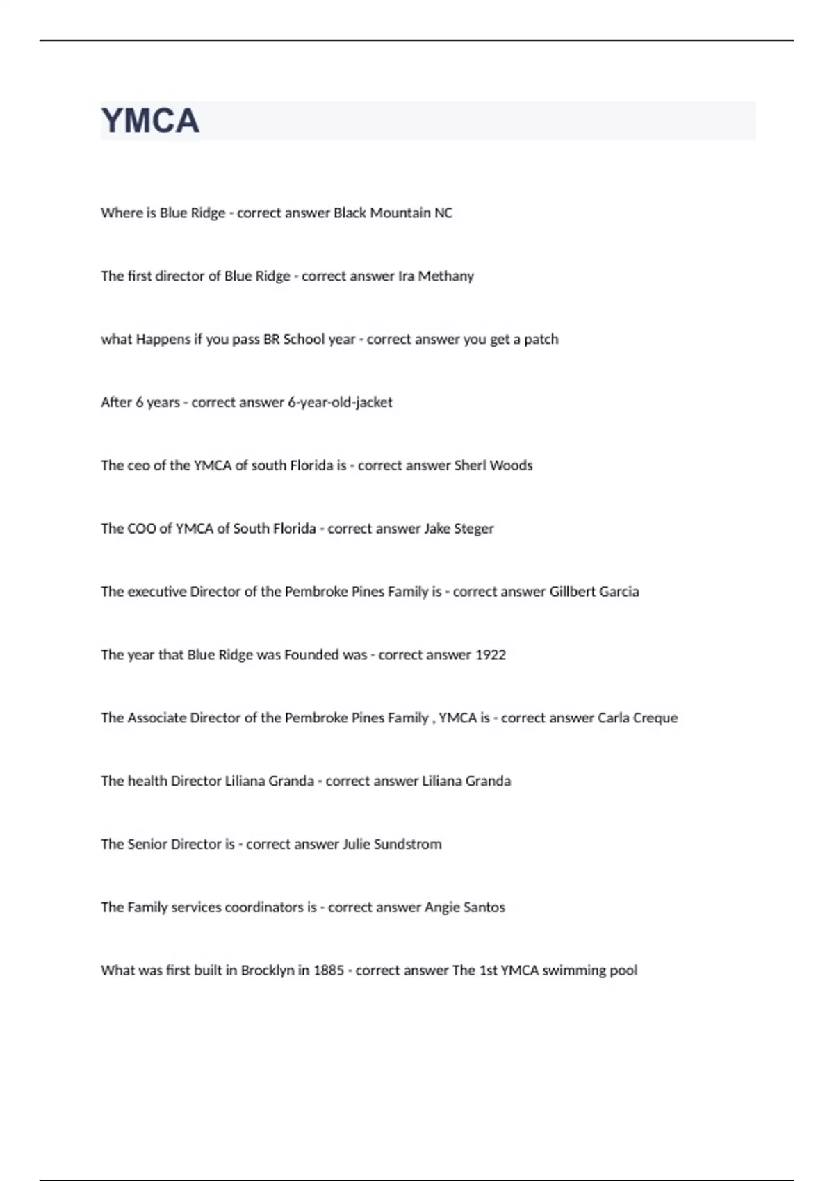 YMCA Where is Blue Ridge - correct answer Black Mountain NC The first director of Blue Ridge - correct answer Ira Methany what Happens if you pass BR School year - correct answer you get a patch After 6 years - correct answer 6-year-old-jacket The ceo of the YMCA of south Florida is - correct answer Sherl Woods The COO of YMCA of South Florida - correct answer Jake Steger The executive Director of the Pembroke Pines Family is - correct answer Gillbert Garcia The year that Blue Ridge was Founded was - correct answer 1922 The Associate Director of the Pembroke Pines Family , YMCA is - correct answer Carla Creque The health Director Liliana Granda - correct answer Liliana Granda The Senior Director is - correct answer Julie Sundstrom The Family services coordinators is - correct answer Angie Santos What was first built in Brocklyn in 1885 - correct answer The 1st YMCA swimming pool What are the three areas YMCA - correct answer Healthy living Social responsibility youth development Who organized the first leaders ship club in 1885 - correct answer Dr.J Garner Smith What did George Williams - correct answer Found YMCA in London England When teaching a group of children what should you do - correct answer Try to teach someone a new skill What did the YMCA invent - correct answer Basketball and volleyball - correct answer