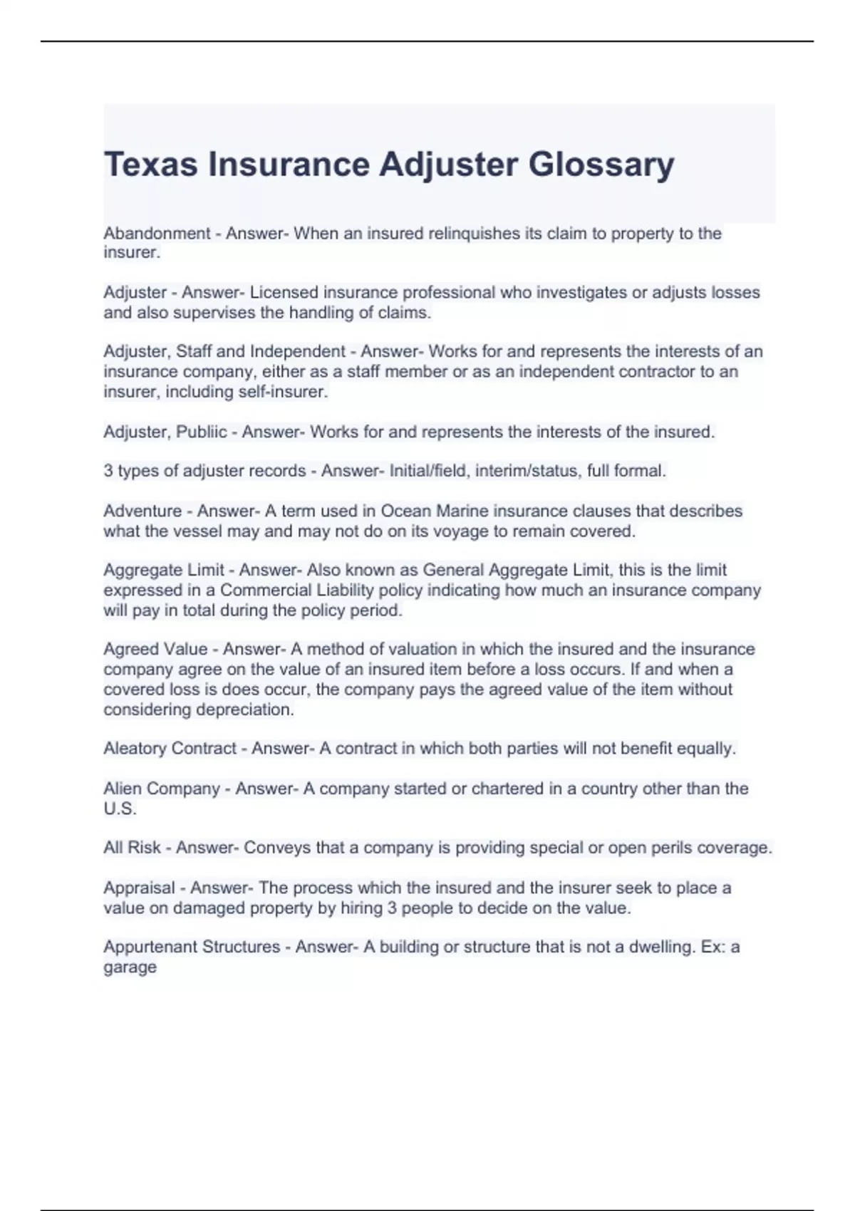 Texas Insurance Adjuster Glossary Exam with complete solutions