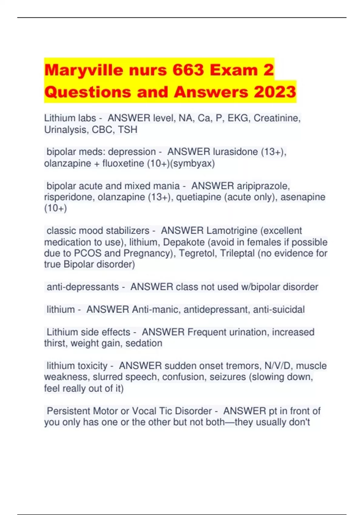 Maryville nurs 663 Exam 2 Questions and Answers 2023 Lithium labs - ANSWER level, NA, Ca, P, EKG, Creatinine, Urinalysis, CBC, TSH bipolar meds: depression - ANSWER lurasidone (13+), olanzapine + fluoxetine (10+)(symbyax) bipolar acute and mixed mania - ANSWER aripiprazole, risperidone, olanzapine (13+), quetiapine (acute only), asenapine (10+) classic mood stabilizers - ANSWER Lamotrigine (excellent medication to use), lithium, Depakote (avoid in females if possible due to PCOS and Pregnancy), Tegretol, Trileptal (no evidence for true Bipolar disorder) anti-depressants - ANSWER class not used w/bipolar disorder lithium - ANSWER Anti-manic, antidepressant, anti-suicidal Lithium side effects - ANSWER Frequent urination, increased thirst, weight gain, sedation lithium toxicity - ANSWER sudden onset tremors, N/V/D, muscle weakness, slurred speech, confusion, seizures (slowing down, feel really out of it) Persistent Motor or Vocal Tic Disorder - ANSWER pt in front of you only has one or the other but not both—they usually don't even know it is a tic, it is only meaningful if it's affecting their quality of life Tourette's d/o - ANSWER Multiple motor and at least one vocal tic (some tics come and go, they don't have them all at the same time to receive the diagnosis) HRT - ANSWER habit reversal training can be used to manage tics Tics tx - ANSWER Alpha agonists (clonidine, guanfacine); Haldol is not the first-line txt Developmental Coordination Disorder - ANSWER a motor disorder characterized by marked impairment in the development of motor coordination; movement isn't consistent w/age Stereotypic Movement Disorder - ANSWER a motor disorder characterized by repetitive, seemingly driven, and apparently purposeless motor behavior, such as hand waving or head banging, but not include ASD sx Specific Learning Disorders - ANSWER difficulties in the acquisition and use of listening, speaking, reading, writing, reasoning, or mathematical abilities; dx by other professionals w/specialized training; NP tx comorbid d/o