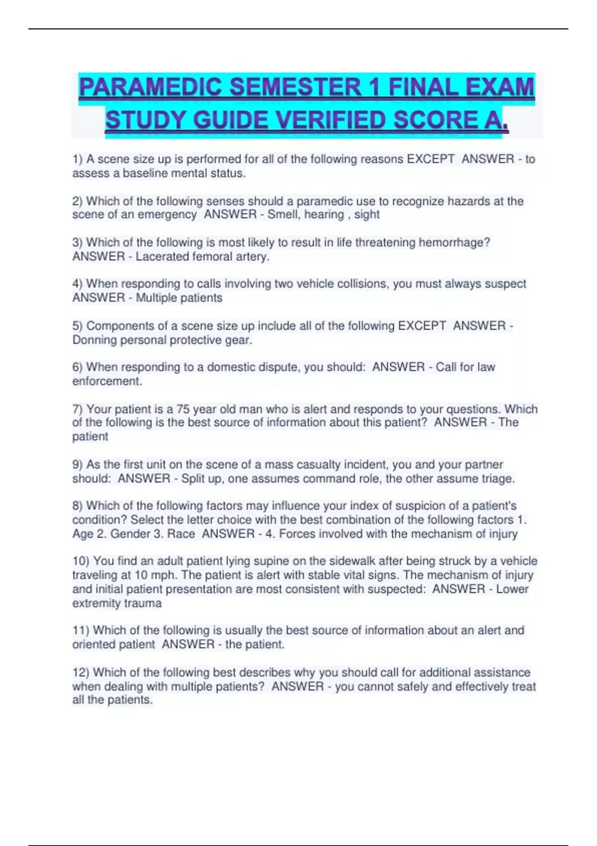 PARAMEDIC SEMESTER 1 FINAL EXAM STUDY GUIDE VERIFIED SCORE A.