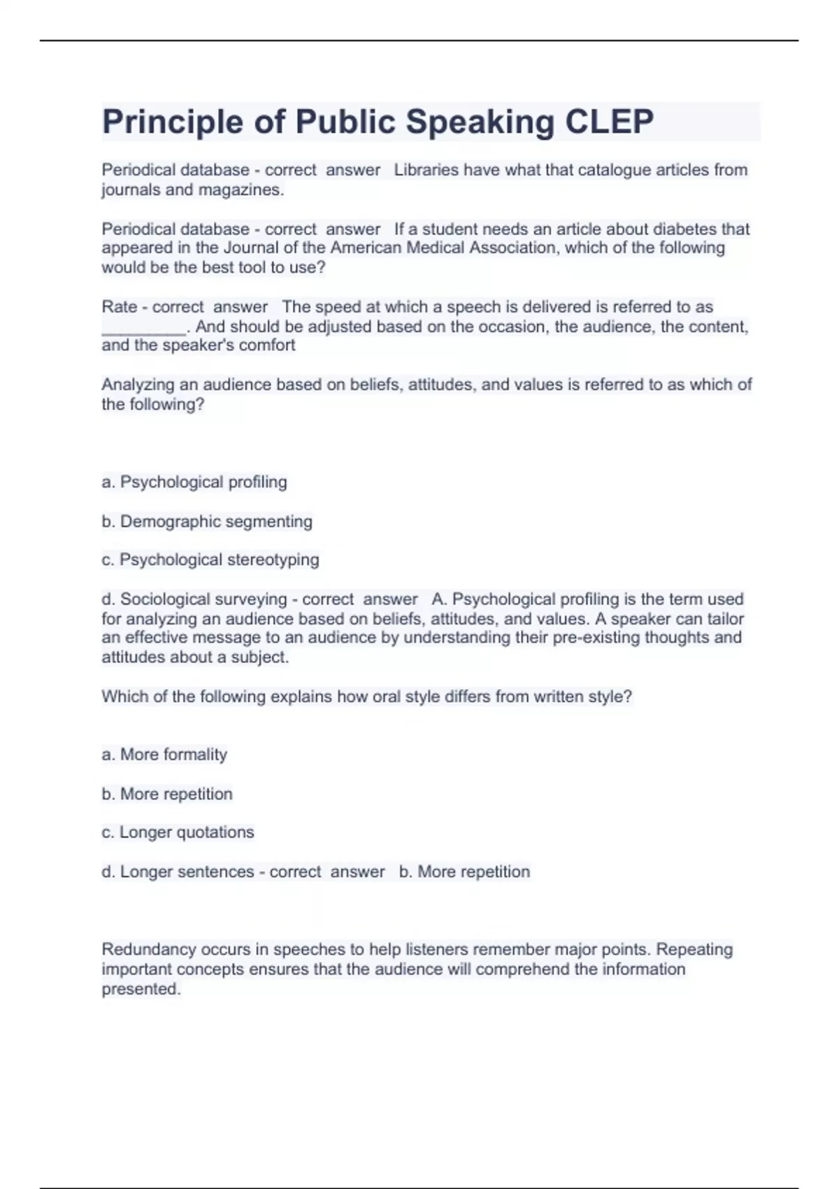 Principle of Public Speaking CLEP Question and answers already passed 2023/2024Periodical database - correct answer Libraries have what that catalogue articles from journals and magazines. Periodical database - correct answer If a student needs an article about diabetes that appeared in the Journal of the American Medical Association, which of the following would be the best tool to use? Rate - correct answer The speed at which a speech is delivered is referred to as _________. And should be adjusted based on the occasion, the audience, the content, and the speaker's comfort