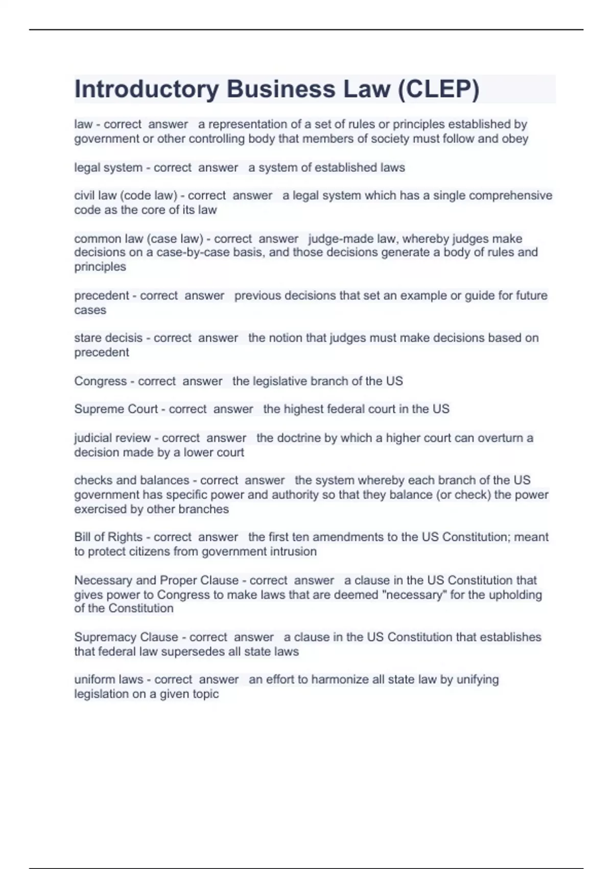 Introductory Business Law Question and answers already passed 2023/2024 law - correct answer a representation of a set of rules or principles established by government or other controlling body that members of society must follow and obey legal system - correct answer a system of established laws civil law (code law) - correct answer a legal system which has a single comprehensive code as the core of its law common law (case law) - correct answer judge-made law, whereby judges make decisions on a case-by-case basis, and those decisions generate a body of rules and principles precedent - correct answer previous decisions that set an example or guide for future cases