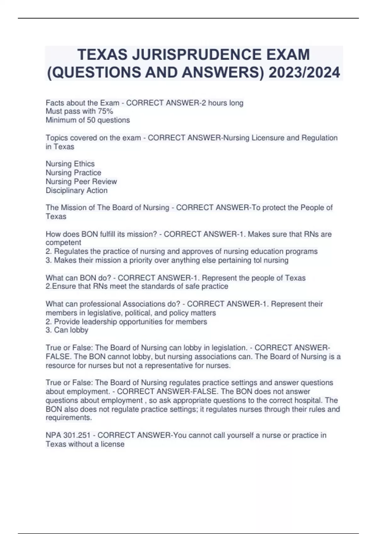 TEXAS JURISPRUDENCE EXAM (QUESTIONS AND ANSWERS) 2023/2024 Facts about the Exam - CORRECT ANSWER-2 hours long Must pass with 75% Minimum of 50 questions Topics covered on the exam - CORRECT ANSWER-Nursing Licensure and Regulation in Texas Nursing Ethics Nursing Practice Nursing Peer Review Disciplinary Action The Mission of The Board of Nursing - CORRECT ANSWER-To protect the People of Texas How does BON fulfill its mission? - CORRECT ANSWER-1. Makes sure that RNs are competent 2. Regulates the practice of nursing and approves of nursing education programs 3. Makes their mission a priority over anything else pertaining tol nursing What can BON do? - CORRECT ANSWER-1. Represent the people of Texas 2.Ensure that RNs meet the standards of safe practice What can professional Associations do? - CORRECT ANSWER-1. Represent their members in legislative, political, and policy matters 2. Provide leadership opportunities for members 3. Can lobby True or False: The Board of Nursing can lobby in legislation. - CORRECT ANSWERFALSE. The BON cannot lobby, but nursing associations can. The Board of Nursing is a resource for nurses but not a representative for nurses. True or False: The Board of Nursing regulates practice settings and answer questions about employment. - CORRECT ANSWER-FALSE. The BON does not answer questions about employment , so ask appropriate questions to the correct hospital. The BON also does not regulate practice settings; it regulates nurses through their rules and requirements. NPA 301.251 - CORRE