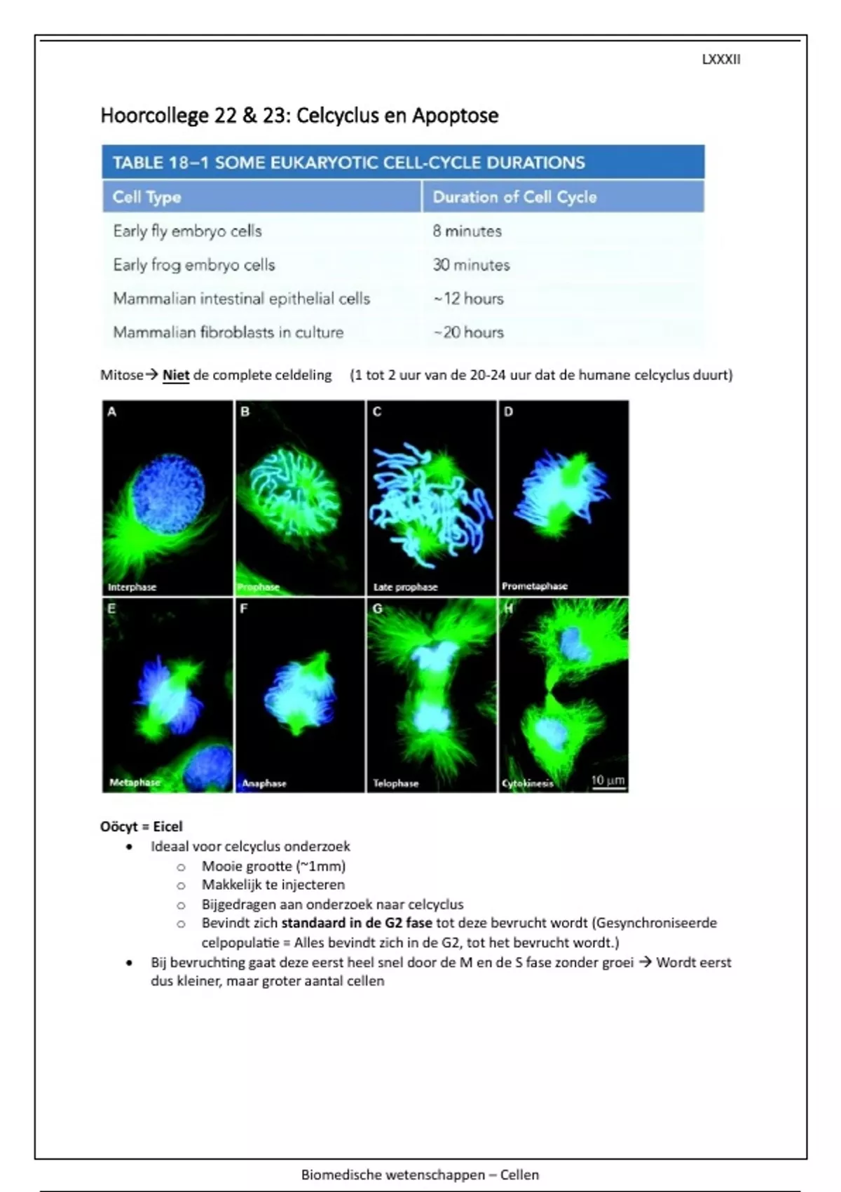 Alle behandelde stof uit het 22e en 23e hoorcollege van het vak 'Cellen'. De rol van Cdk's, Cdki's, caspases, tumorsupressorgenen en oncogenen wordt uitgelegd a.d.h.v. hun invloed op de celcyclus. Daarnaast wordt het proces apoptose uitgelegd. Gegeven op de opleiding Biomedische Wetenschappen aan Universiteit Utrecht.