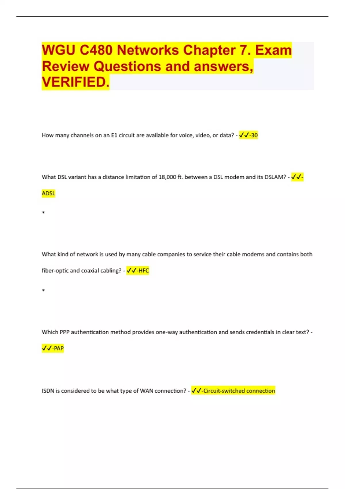 WGU C480 Networks Chapter 7. Exam Review Questions and answers, VERIFIED. How many channels on an E1 circuit are available for voice, video, or data? - -30 What DSL variant has a distance limitation of 18,000 ft. between a DSL modem and its DSLAM? - - ADSL * What kind of network is used by many cable companies to service their cable modems and contains both fiber-optic and coaxial cabling? - -HFC * Which PPP authentication method provides one-way authentication and sends credentials in clear text? - -PAP ISDN is considered to be what type of WAN connection? - -Circuit-switched connection What locally significant identifier is used by a Frame Relay network to reference a virtual circuit? - - DLCI * How big is the payload portion of an ATM cell? - -48 bytes What is the size of an MPLS header? - -32 bits ATM can be considered in which of the following WAN categories? - -Packet switched Cell switched ATM is considered a packet switched type of technology. Because it uses fixed-length cells, sometimes you will see it specified as cell switched. What technology is typically used in conjunction with DSL? - -PPPoE What technology is similar to WiMAX and offers wireless broadband service? The maximum data rate is 84 Mbps. - -HSPA+ Like WiMAX, Evolved High-Speed Packet Access (HSPA+) is a technology offering wireless broadband service. The maximum data rate for HSPA+ is 84 Mbps Where is PPPoE typically used in a DSL environment? - -Betw