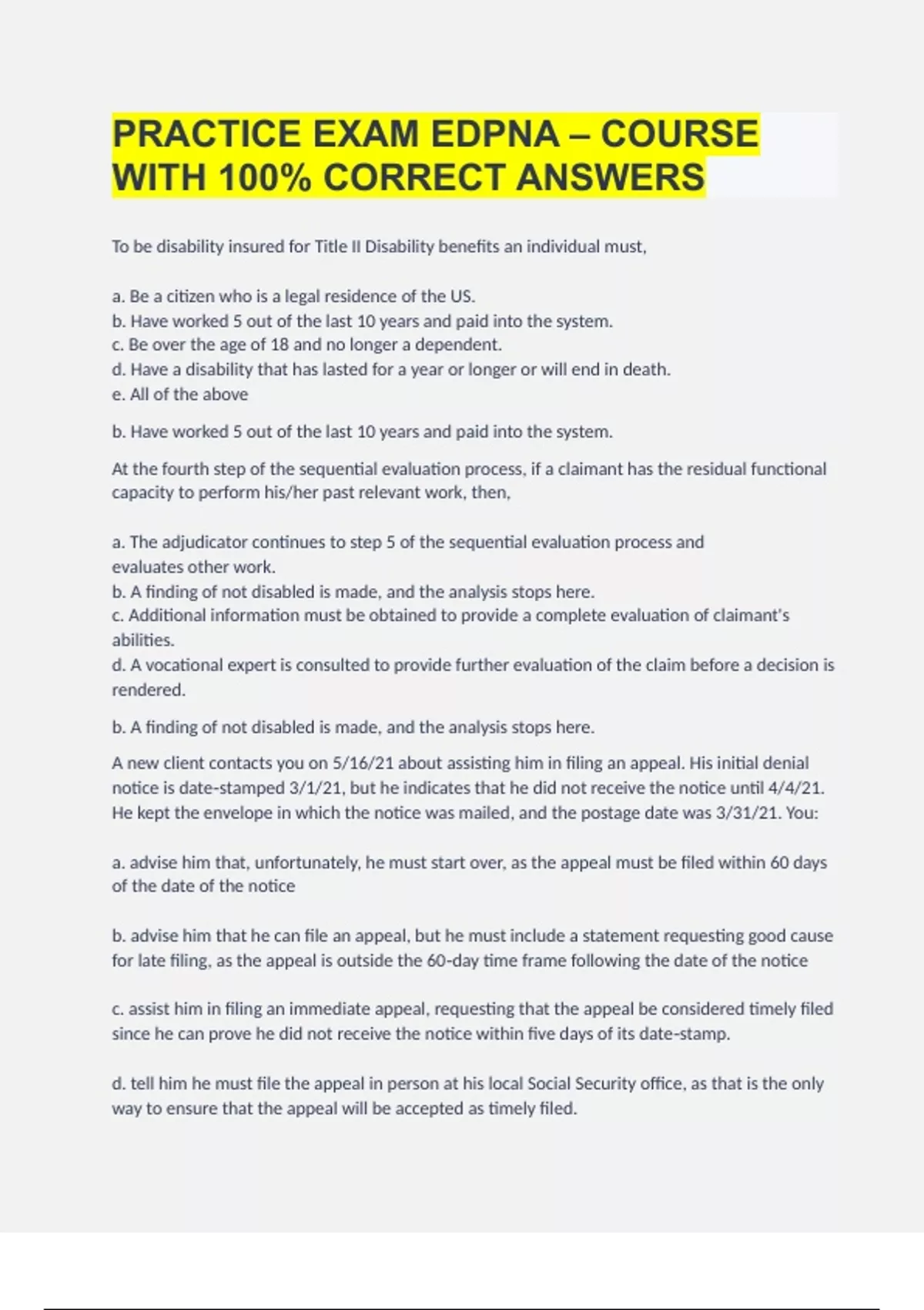 PRACTICE EXAM EDPNA – COURSE WITH 100% CORRECT ANSWERS