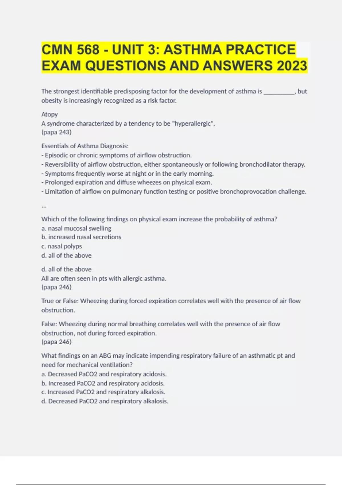 CMN 568 - UNIT 3 ASTHMA PRACTICE EXAM QUESTIONS AND ANSWERS 2023