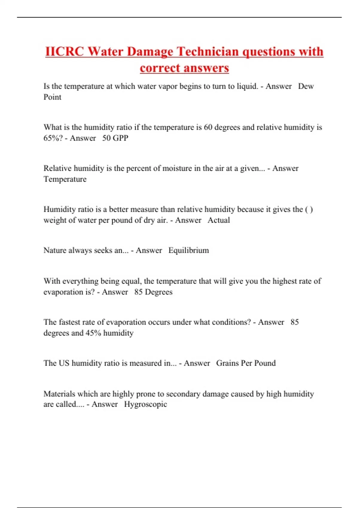 Is the temperature at which water vapor begins to turn to liquid. - Answer Dew Point What is the humidity ratio if the temperature is 60 degrees and relative humidity is 65%? - Answer 50 GPP Relative humidity is the percent of moisture in the air at a given... - Answer Temperature Humidity ratio is a better measure than relative humidity because it gives the ( ) weight of water per pound of dry air. - Answer Actual Nature always seeks an... - Answer Equilibrium With everything being equal, the temperature that will give you the highest rate of evaporation is? - Answer 85 Degrees The fastest rate of evaporation occurs under what conditions? - Answer 85 degrees and 45% humidity The US humidity ratio is measured in..