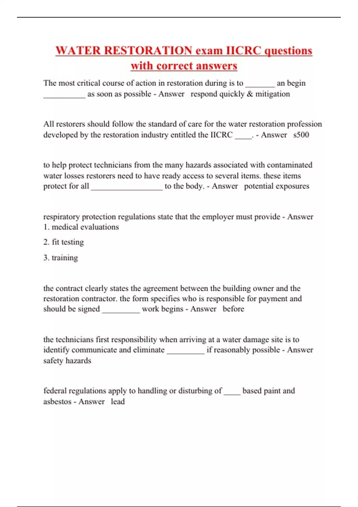 The most critical course of action in restoration during is to _______ an begin __________ as soon as possible - Answer respond quickly & mitigation All restorers should follow the standard of care for the water restoration profession developed by the restoration industry entitled the IICRC ____. - Answer s500 to help protect technicians from the many hazards associated with contaminated water losses restorers need to have ready access to several items. these items protect for all _________________ to the body. - Answer potential exposures respiratory protection regulations state that the employer must provide - Answer 1. medical evaluations 2. fit testing 3. training the contract clearly states the agreement between the building owner and the restoration contractor. the form specifies who is responsible for payment and should be signed _________ work begins - Answer before the technicians first responsibility when arriving at a water damage site is to identify communicate and eliminate _________ if reasonably possible - Answer safety hazards federal regulations apply to handling or disturbing of ____ based paint and asbestos - Answer lead