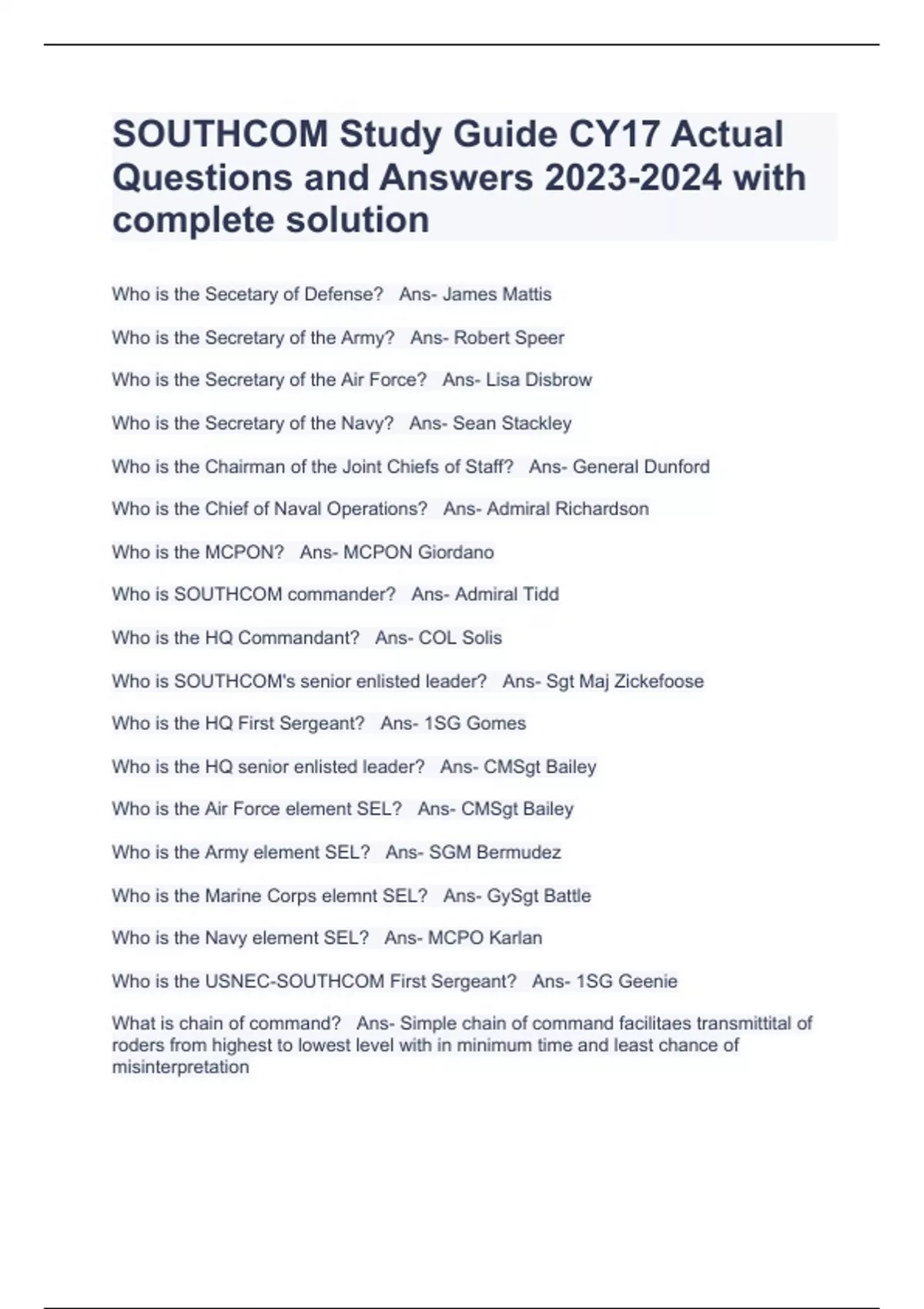 SOUTHCOM Study Guide CY17 Actual Questions and Answers with complete solution