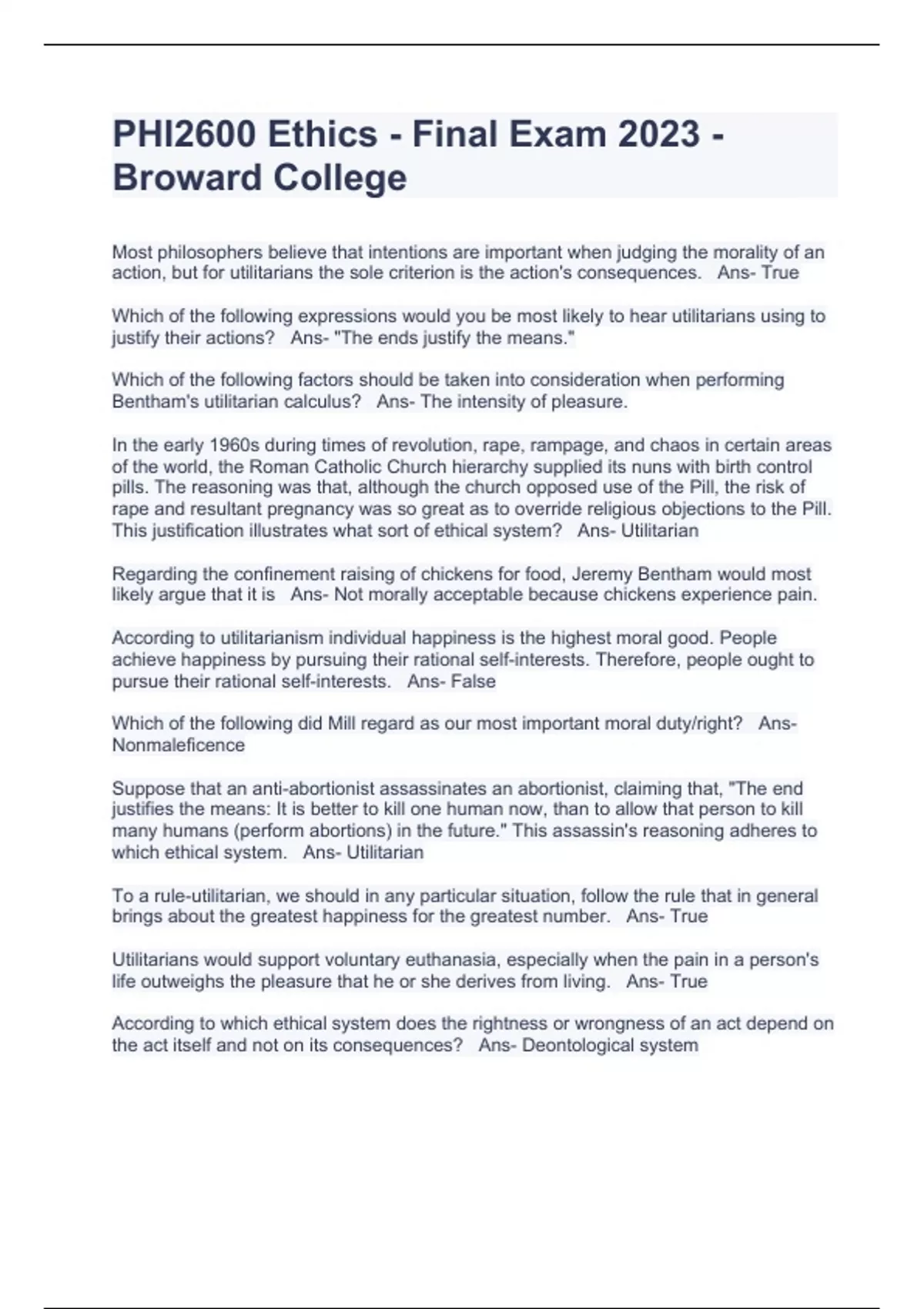 PHI2600 Ethics - Final Exam 2023 - Broward College