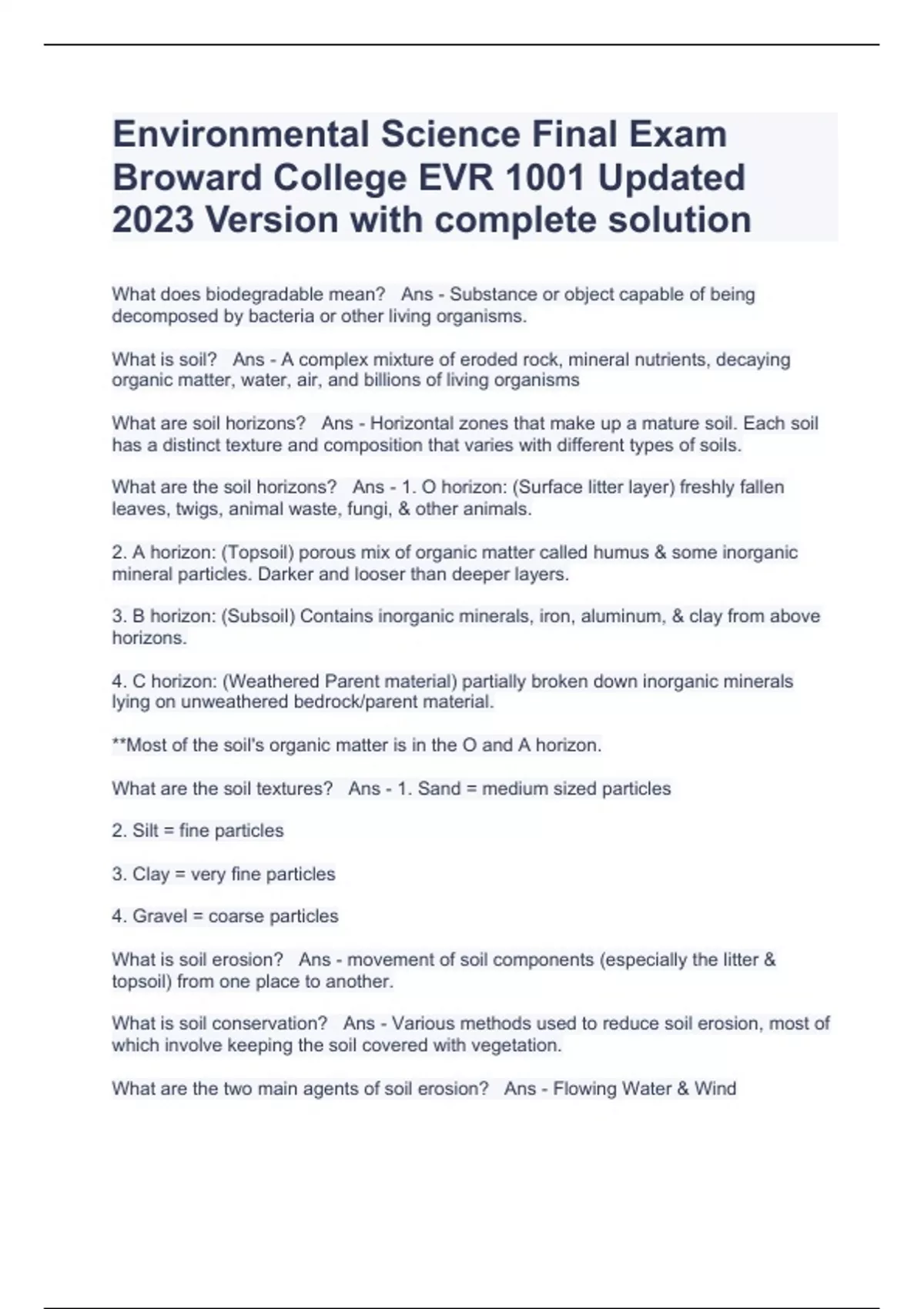 Environmental Science Final Exam Broward College EVR 1001 Updated 2023 Version with complete solution