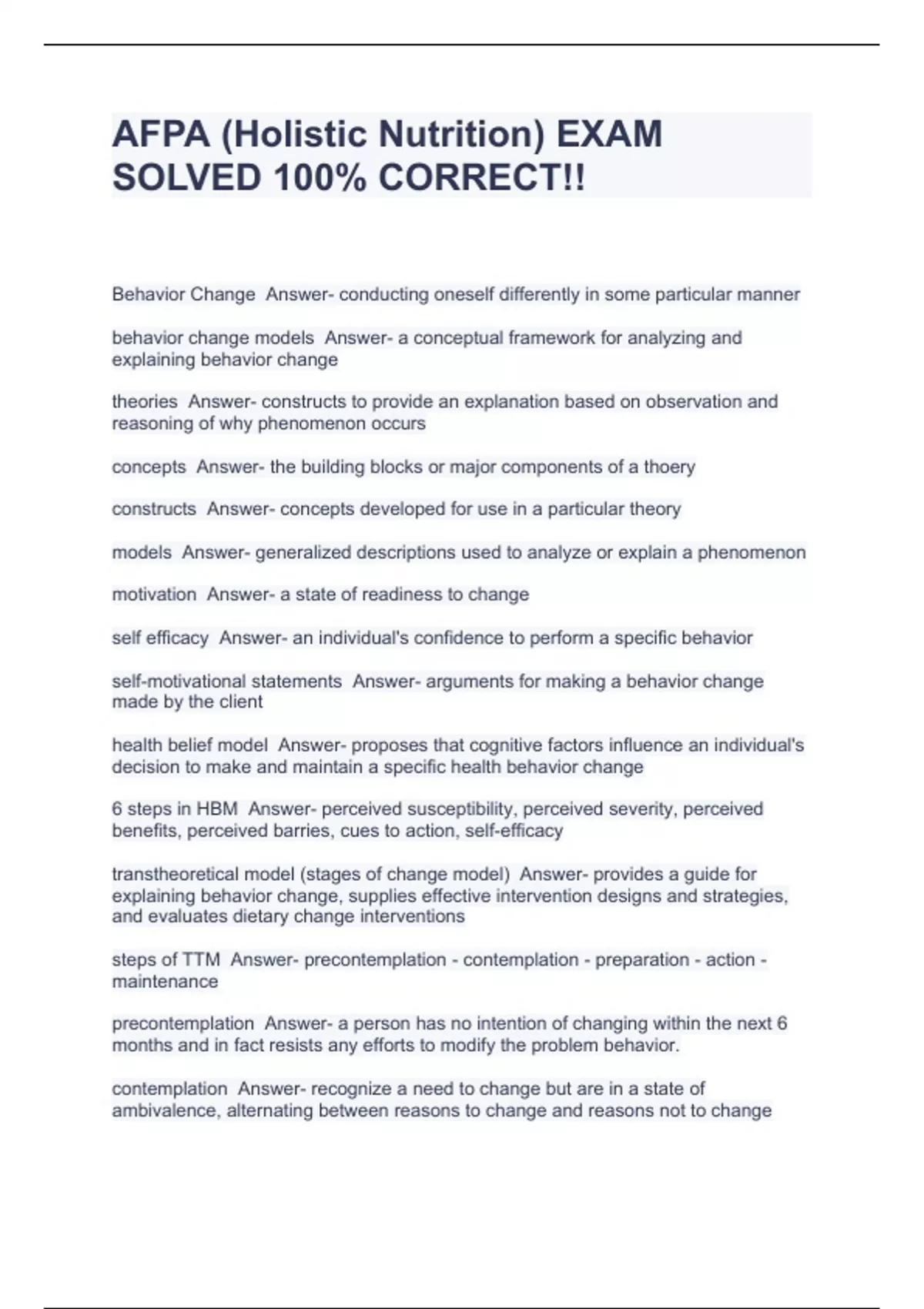 AFPA (Holistic Nutrition) EXAM SOLVED 100% CORRECT!!
