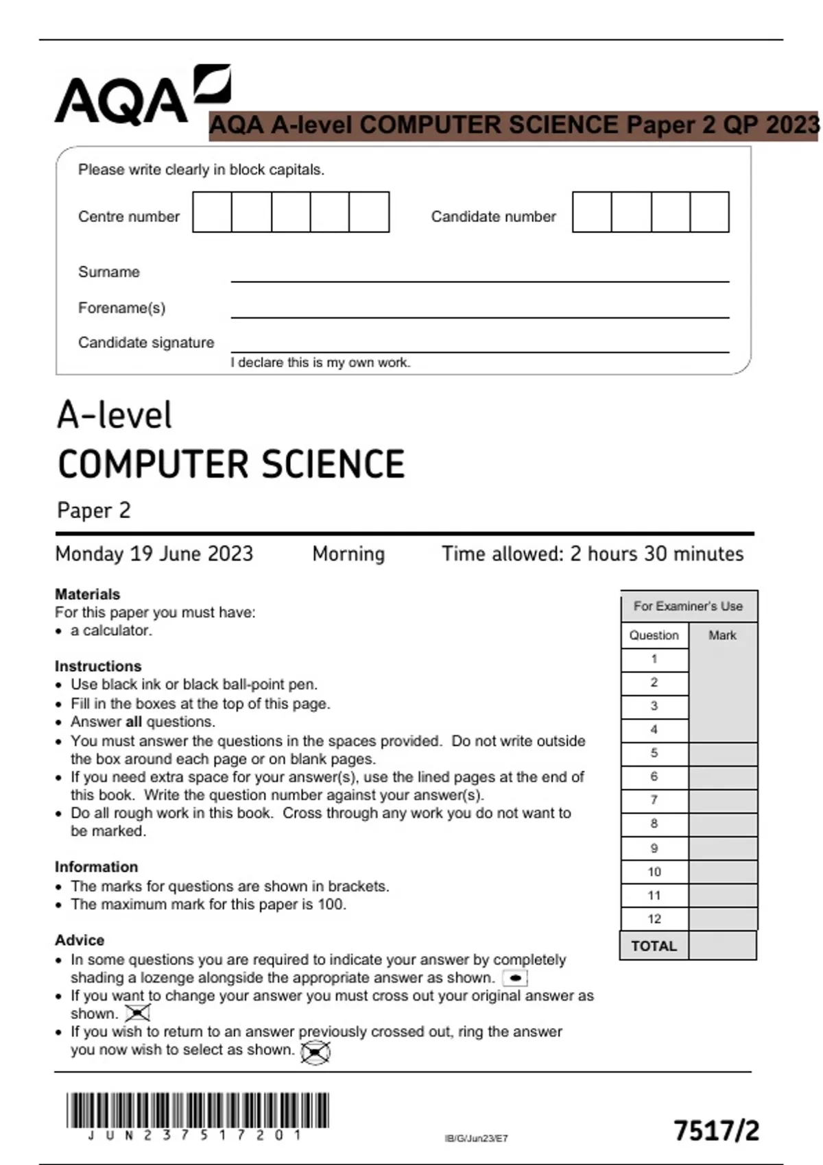 AQA A-level COMPUTER SCIENCE Paper 2 QP 2023