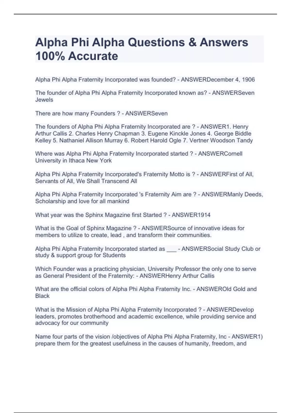 Alpha Phi AlphAlpha Phi Alpha Questions & Answers 100% AccurateAlpha Phi Alpha Questions & Answers 100% Accuratea Phi Alpha Questions & Answers 100% AccurateQuestions & Answers 100% Accurate Alpha Phi Alpha Fraternity Incorporated was founded? - ANSWERDecember 4, 1906 The founder of Alpha Phi Alpha Fraternity Incorporated known as? - ANSWERSeven Jewels There are how many Founders ? - ANSWERSeven The founders of Alpha Phi Alpha Fraternity Incorporated are ? - ANSWER1. Henry Arthur Callis 2. Charles Henry Chapman 3. Eugene Kinckle Jones 4. George Biddle Kelley 5. Nathaniel Allison Murray 6. Robert Harold Ogle 7. Vertner Woodson Tandy Where was Alpha Phi Alpha Fraternity Incorporated started ? - ANSWERCornell University in Ithaca New York