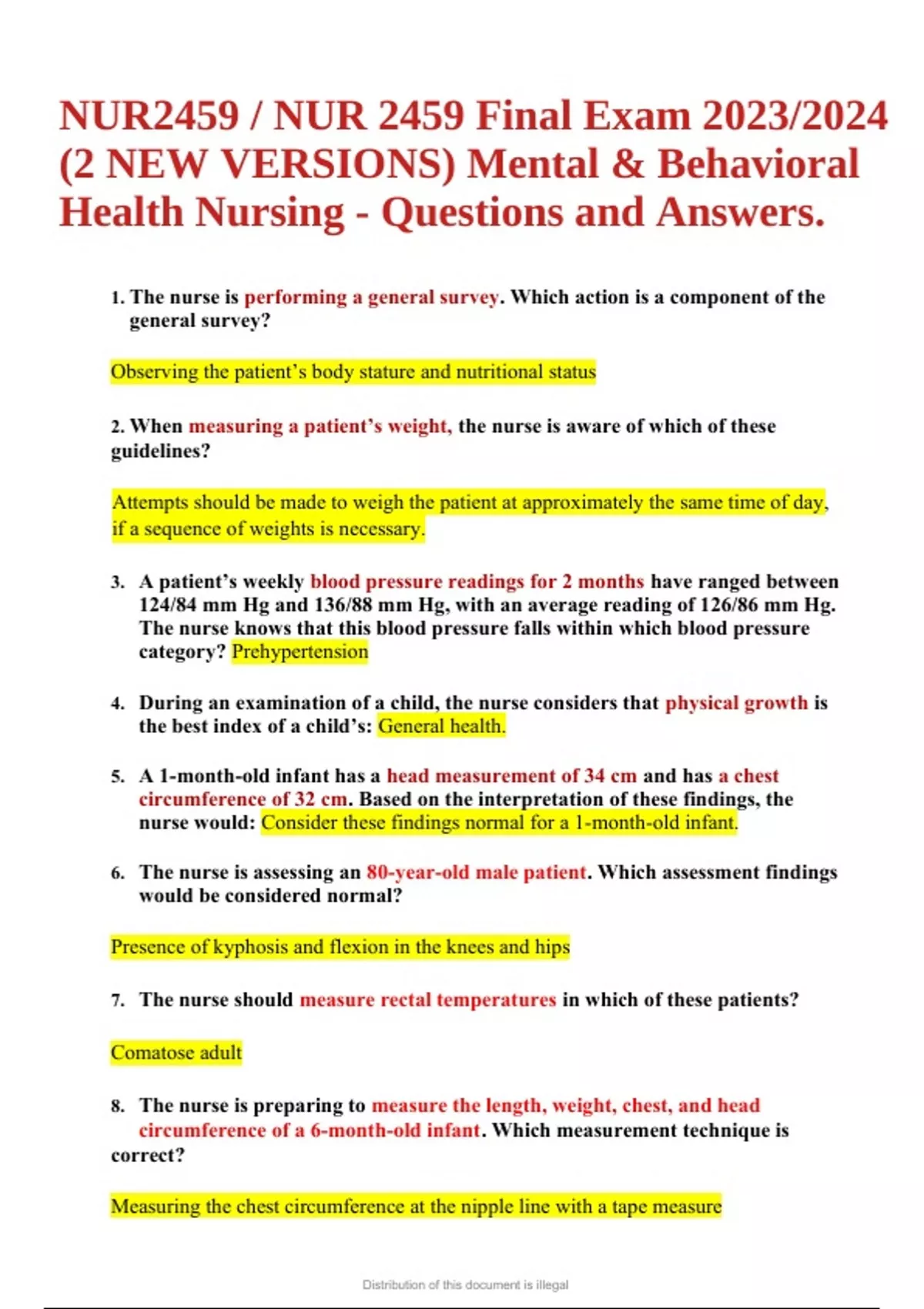NUR2459 / NUR 2459 Final Exam 2023/2024 (2 NEW VERSIONS) Mental & Behavioral Health Nursing - Questions and Answers. 1. The nurse is performing a general survey. Which action is a component of the general survey? Observing the patient’s body stature and nutritional status 2. When measuring a patient’s weight, the nurse is aware of which of these guidelines? Attempts should be made to weigh the patient at approximately the same time of day, if a sequence of weights is necessary. 3. A patient’s weekly blood pressure readings for 2 months have ranged between 124/84 mm Hg and 136/88 mm Hg, with an average reading of 126/86 mm Hg. The nurse knows that this blood pressure falls within which blood pressure category? Prehypertension 4. During an examination of a child, the nurse considers that physical growth is the best index of a child’s: General health. 5. A 1-month-old infant has a head measurement of 34 cm and has a chest circumference of 32 cm. Based on the interpretation of these findings, the nurse would: Consider these findings normal for a 1-month-old infant. 6. The nurse is assessing an 80-year-old male patient. Which assessment findings would be considered normal? Presence of kyphosis and flexion in the knees and hips 7. The nurse should measure rectal temperatures in which of these patients? Comatose adult 8. The nurse is preparing to measure the length, weight, chest, and head circumference of a 6-month-old infant. Which measurement technique is correct? Measuring the chest circumference at the nipple line with a tape measure NUR2459 / NUR 2459 Final Exam 2023/2024 (2 NEW VERSIONS) Mental & Behavioral Health Nursing - Questions and Answers. NUR2459 / NUR 2459: Final Exam (Latest 2023/ 2024) Mental & Behavioral Health Nursing Distribution of this document is illegal 9. The nurse knows that one advantage of the tympanic membrane thermometer (TMT) is that: Rapid measurement is useful for uncooperative younger children. 10. When assessing an older adult, which vital sign changes occur with aging? Widened pulse pressure 11. The nurse is examining a patient who is complaining of feeling cold. Which is a mechanism of heat loss in the body? Radiation 12. When measuring a patients body temperature, the nurse keeps in mind that body temperature is influenced by: Diurnal cycle. 13. When evaluating the temperature of older adults, the nurse should remember which aspect about an older adult’s body temperature The body temperature of the older adult is lower than that of a younger adult. 14. A 60-year-old male patient has been treated for pneumonia for the past 6 weeks. He is seen today in the clinic for an unexplained weight loss of 10 pounds over the last 6 weeks. The nurse knows that: Unexplained weight loss often accompanies short-term illnesses. 15. When assessing a 75-year-old patient who has asthma, the nurse notes that he assumes a tripod position, leaning forward with arms braced on the chair. On the basis of this observation, the nurse should: d. 16. Which of these actions illustrates the correct technique the nurse should use when assessing oral temperature with a mercury thermometer? b. Leave the thermometer in place 3 to 4 minutes if the patient is afebrile. 17. The nurse is taking temperatures in a clinic with a TMT. Which statement is true regarding use of the TMT? Recognize that a tripod position is often used when a patient is having respiratory difficulties. NUR2459 / NUR 2459: Final Exam (Latest 2023/ 2024) Mental & Behavioral Health Nursing Distribution of this document is illegal c. 18. To assess a rectal temperature accurately in an adult, the nurse would: a. Use a lubricated blunt tip thermometer. 19. Which technique is correct when the nurse is assessing the radial pulse of a patient? The pulse is counted for: a. 1 minute, if the rhythm is irregular. 20. When assessing a patient’s pulse, the nurse should also notice which of these characteristics? Force 21. When assessing the pulse of a 6-year-old boy, the nurse notices that his heart rate varies with his respiratory cycle, speeding up at the peak of inspiration and slowing to normal with expiration. The nurses next action would be to: b. Consider this finding normal in children and young adults. 22. When assessing the force, or strength, of a pulse, the nurse recalls that the pulse: c. Is a reflection of the hearts stroke volume. 23. The nurse is assessing the vital signs of a 20-year-old male marathon runner and documents the following vital signs: temperature36 C; pulse48 beats per minute; respirations14 breaths per minute; blood pressure104/68 mm Hg. Which statement is true concerning these results? b. These are normal vital signs for a healthy, athletic adult. 24. The nurse is assessing the vital signs of a 3-year-old patient who appears to have an irregular respiratory pattern. How should the nurse assess this child’s respirations? a. 25. A patient’s blood pressure The risk of cross-contamination is reduced, compared with the rectal route. Respirations should be counted for 1 full minute, noticing rate and rhythm. NUR2459 / NUR 2459: Final Exam (Latest 2023/ 2024) Mental & Behavioral Health Nursing Distribution of this document is illegal is 118/82 mm Hg. He asks the nurse, what do the numbers mean? The nurses best reply is: c. 26. While measuring a patient’s blood pressure, the nurse recalls that certain factors, such as , help determine blood pressure. d. Peripheral vascular resistance 27. A nurse is helping at a health fair at a local mall. When taking blood pressures on a variety of people, the nurse keeps in mind that: b. 28. The nurse notices a colleague is preparing to check the blood pressure of a patient who is obese by using a standard-sized blood pressure cuff. The nurse should expect the reading to: b. Yield a falsely high blood pressure. 29. A student is late for his appointment and has rushed across campus to the health clinic. The nurse should: a. 30. The nurse will perform a palpate
