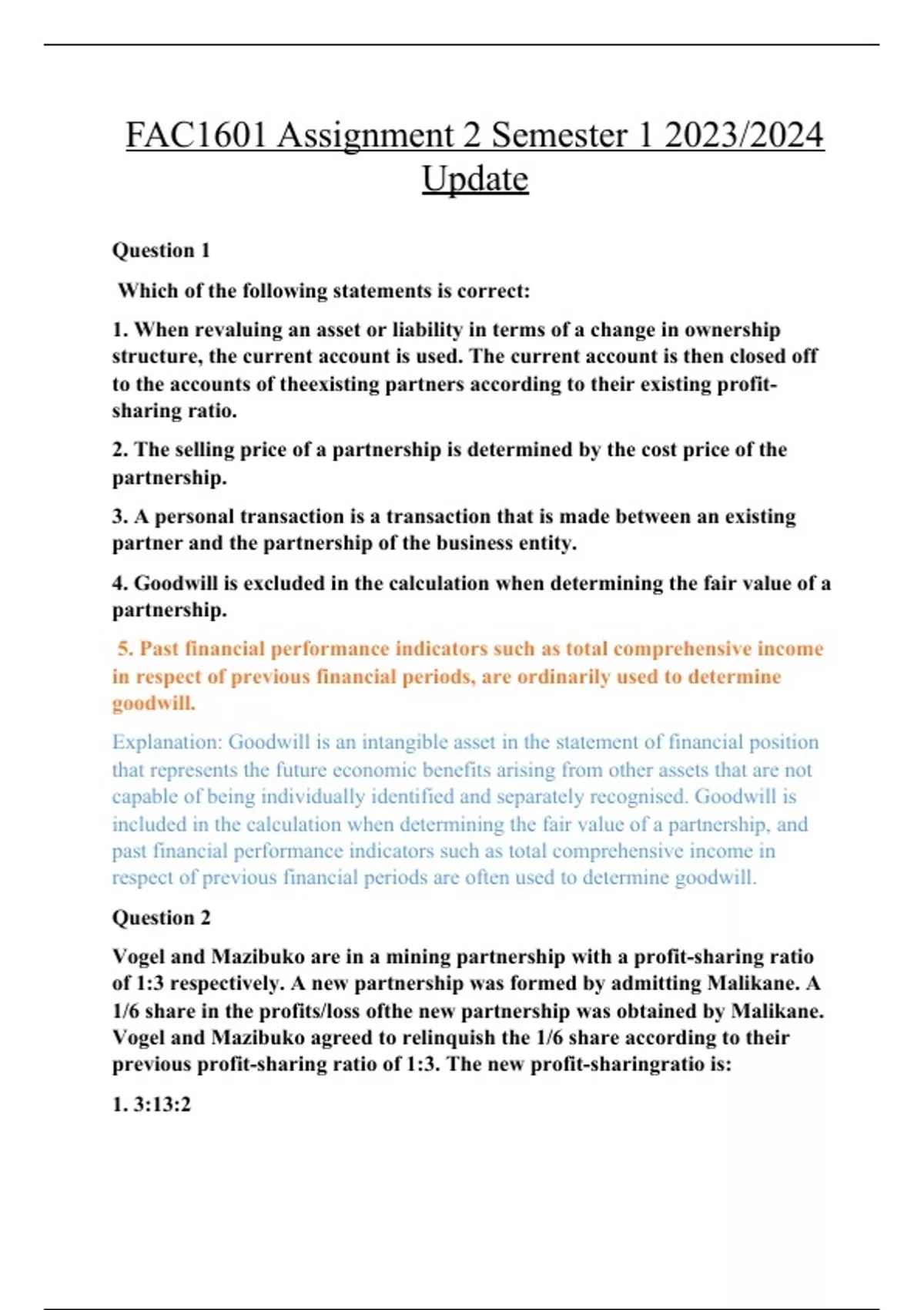 1. Goodwill is a non-current tangible asset in the statement of financial