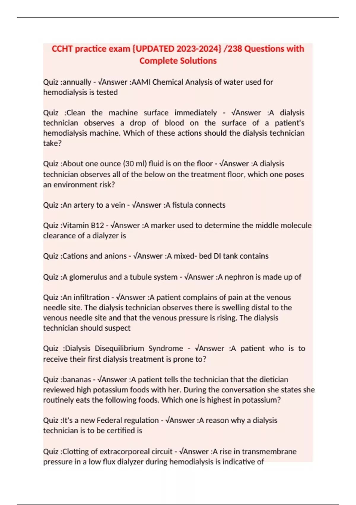 CCHT practice exam {UPDATED } /238 Questions with Complete Solutions Quiz :annually - √Answer :AAMI Chemical Analysis of water used for hemodialysis is tested
