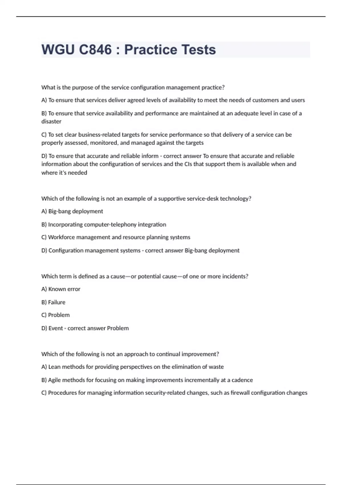 WGU C846 Practice TestsWhat is the purpose of the service configuration management practice? A) To ensure that services deliver agreed levels of availability to meet the needs of customers and users B) To ensure that service availability and performance are maintained at an adequate level in case of a disaster C) To set clear business-related targets for service performance so that delivery of a service can be properly assessed, monitored, and managed against the targets D) To ensure that accurate and reliable inform - correct answer To ensure that accurate and reliable information about the configuration of services and the CIs that support them is available when and where it's needed Which of the following is not an example of a supportive service-desk technology? A) Big-bang deployment B) Incorporating computer-telephony integration C) Workforce management and resource planning systems D) Configuration management systems - correct answer Big-bang deployment Which term is defined as a cause—or potential cause—of one or more incidents? A) Known error B) Failure C) Problem D) Event - correct answer Problem Which of the following is not an approach to continual improvement? A) Lean methods for providing perspectives on the elimination of waste B) Agile methods for focusing on making improvements incrementally at a cadence C) Procedures for managing information security-related changes, such as firewall configuration changes D) DevOps methods for working holistically and ensuring that improvements are not only designed well but applied effectively - correct answer Procedures for managing information security-related changes, such as firewall configuration changes Which type of changes are not typically included in a change schedule? A) Exception changes B) Emergency changes C) Standard changes D) Normal changes - correct answer Emergency changes Which method advocates a "systems view" that emphasizes close collaboration between enterprise governance, service teams, software development, and technology operations? A) Deployment management B) Risk management C) DevOps D) Relationship management - correct answer DevOps Which of the following statements about the plan value chain activity are true? Each correct answer represents a complete solution. Choose all that apply. A) It outputs a product and service portfolio for the engage activity. B) Key outputs are strategic, tactical, and operational plans. C) A key output is service performance information for design and transition. D) It receives inputs regarding knowledge and information about third-party service components from the engage value chain activity. - correct answer It outputs a product and service portfolio for the engage activity. Key outputs are strategic, tactical, and operational plans. It receives inputs regarding knowledge and information about third-party service components from the engage value chain activity. What is the term for any financially valuable component that can contribute to the delivery of an IT product or service? A) Asset B) Incident C) Event D) Configuration item - correct answer Asset Which of the following is not an activity of information security management? A) It must be driven from the senior-most level of the organization, according to clearly understood governance requirements and organizational policies. B) It creates controls that each practice must consider when planning how work is to be done. C) In high-velocity environments, information security is integrated as much as possible into the daily work of development and operations. D) It creates closer, more collabo - correct answer It creates closer, more collaborative relationships with key suppliers to uncover and realize new value and reduce the risk of failure. When making improvements, what is the benefit of employing the continual improvement model? A) It balances the need to make beneficial changes that deliver additional value with the need to protect customers and users from the adverse effect of change. B) It can be applied to any type of improvement, from high-level organizational changes to individual services and CIs. C) It manages the people aspects of change to ensure that improvements and organizational transformation initiatives are imple - correct answer It can be applied to any type of improvement, from high-level organizational changes to individual services and CIs. Which statements about problem management are true? Reduce the likelihood and impact of incidents by identifying actual and potential causes of incidents. Manage workarounds and known errors. Make new and changed services and features available for use. Record and report selected changes of state identified as events. A) 3 and 4 B) 1 and 3 C) 1 and 2