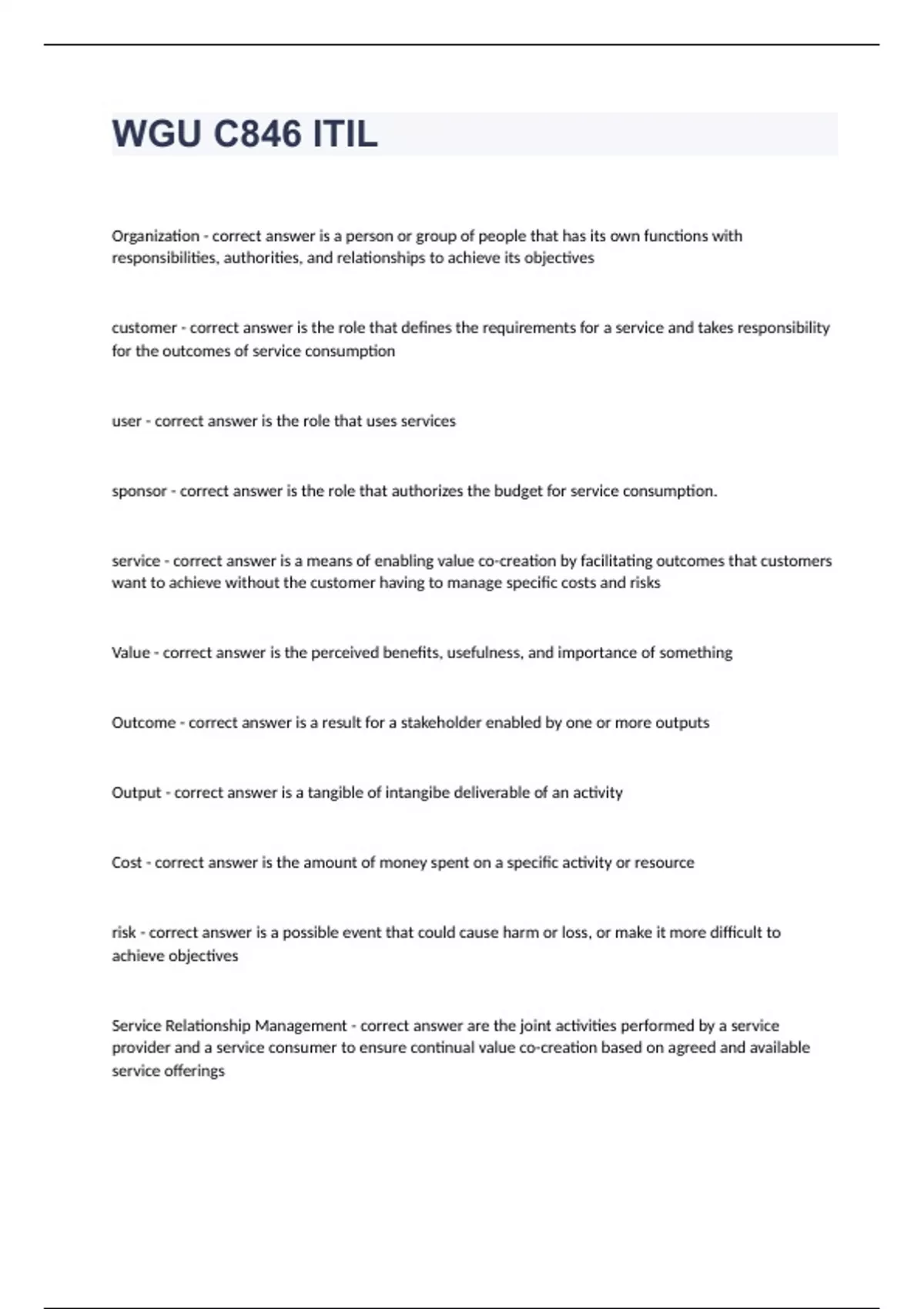 WGU C846 ITILOrganization - correct answer is a person or group of people that has its own functions with responsibilities, authorities, and relationships to achieve its objectives customer - correct answer is the role that defines the requirements for a service and takes responsibility for the outcomes of service consumption user - correct answer is the role that uses services sponsor - correct answer is the role that authorizes the budget for service consumption. service - correct answer is a means of enabling value co-creation by facilitating outcomes that customers want to achieve without the customer having to manage specific costs and risks Value - correct answer is the perceived benefits, usefulness, and importance of something Outcome - correct answer is a result for a stakeholder enabled by one or more outputs Output - correct answer is a tangible of intangibe deliverable of an activity Cost - correct answer is the amount of money spent on a specific activity or resource risk - correct answer is a possible event that could cause harm or loss, or make it more difficult to achieve objectives Service Relationship Management - correct answer are the joint activities performed by a service provider and a service consumer to ensure continual value co-creation based on agreed and available service offerings service offering - correct answer is a formal description of one or more services, designed to address the needs of a target consumer group. A service offering may include goods, access to resources, and service actions. service provision - correct answer is the activities performed by an organization to provide services, including management of the provider's resources, configured to deliver the service; ensuring access to these resources for users; fulfillment of the agreed service actions; service level management; and continual improvement. It may also include the supply of goods. Service Consumption - correct answer is the activities performed by an organization to consume services. It includes the management of the consumer's resources needed to use the service, service actions perform by users, and the receiving (acquiring) or goods (if required). Service Management - correct answer is a set of specialized organizational capabilities for enabling value for customers in the form of services Utility - correct answer is the functionality offered by a product or service to meet a particular need warranty - correct answer is the assurance that a product or service will meet agreed requirements Plan - correct answer ensures a shared understanding of the vision, current status, and improvement direction for all four dimensions and all products and services across an organization Improve - correct answer Ensures continual improvement of products, services, and practices across all value chain activities and the four dimensions of service management. Engage - correct answer provides a good understanding of stakeholder needs, transparency, continual engagement, and good relationships with all stakeholders. Design & Transition - correct answer Ensures products and services continually meet stakeholder expectations for quality, costs, and time to market.