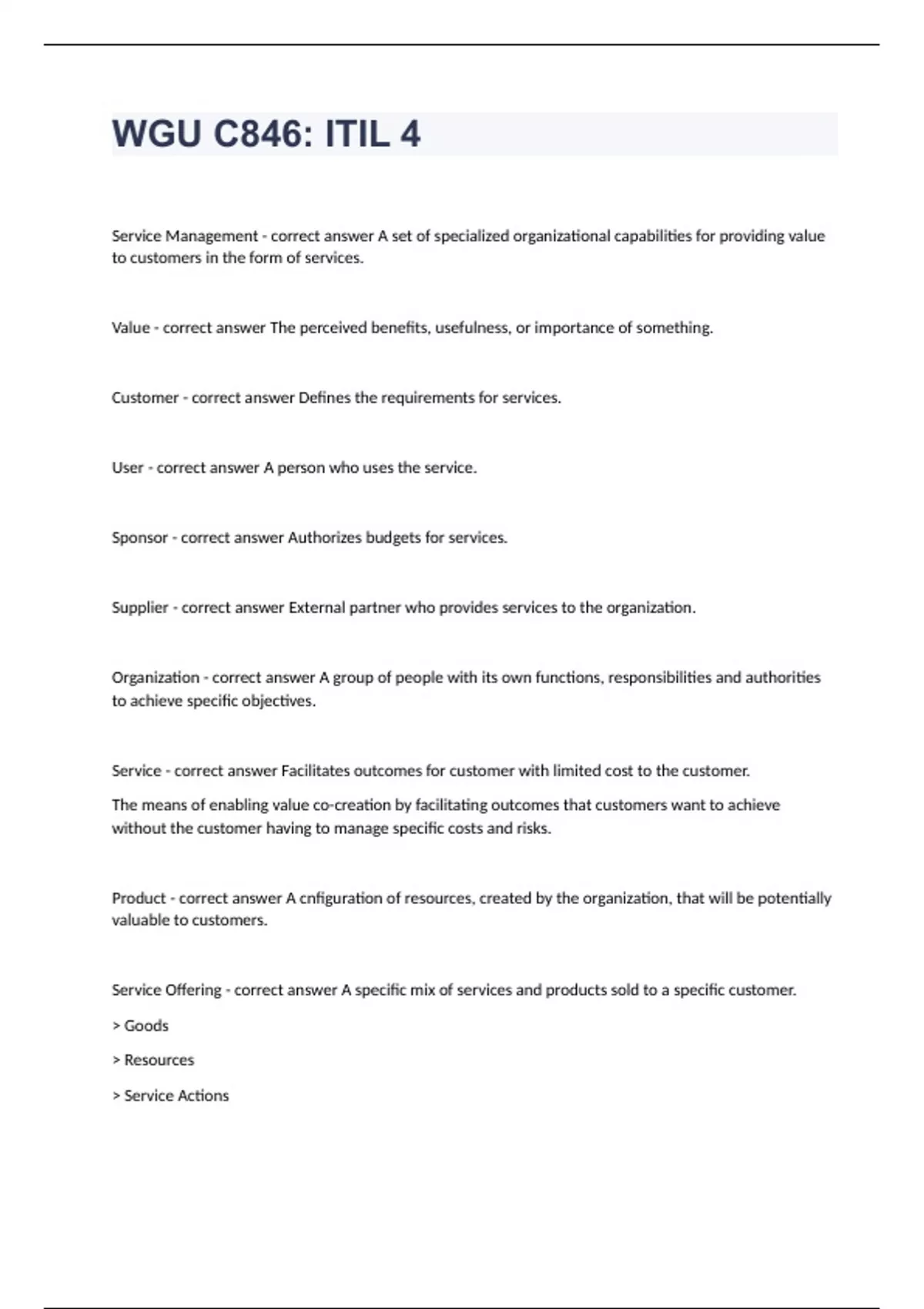 WGU C846 ITIL 4 Service Management - correct answer A set of specialized organizational capabilities for providing value to customers in the form of services. Value - correct answer The perceived benefits, usefulness, or importance of something. Customer - correct answer Defines the requirements for services. User - correct answer A person who uses the service. Sponsor - correct answer Authorizes budgets for services. Supplier - correct answer External partner who provides services to the organization. Organization - correct answer A group of people with its own functions, responsibilities and authorities to achieve specific objectives. Service - correct answer Facilitates outcomes for customer with limited cost to the customer. The means of enabling value co-creation by facilitating outcomes that customers want to achieve without the customer having to manage specific costs and risks. Product - correct answer A cnfiguration of resources, created by the organization, that will be potentially valuable to customers. Service Offering - correct answer A specific mix of services and products sold to a specific customer. > Goods > Resources > Service Actions Service Offering: Goods - correct answer Ownership is transferred to customer. Service Offering: Access to resources - correct answer Customer is allowed to use it. Service Offering: Service Actions - correct answer Things the service provider does for the customer. Output - correct answer A tangible or intangible deliverable of an activity. *Outcome - correct answer A result for a stakeholder enabled by one or more outputs. Cost - correct answer Can be removed from the customer (part of value proposition) and can be imposed on the customer (price for service consumption). Risk - correct answer Possible events that could cause harm or loss. Can be good (opportunity) or bad (hazard). Utility - correct answer Fit for purpose. What the service does. Warranty - correct answer Fit for use. How the service performs. > Availability, Capacity, Continuity, Sercurity good enough? Value = ? - correct answer Utility + Warranty (+ perception) 4 Dimensions of Service Management Model - VOIP - correct answer Can be influenced by the organization. 1 - Organizations & People 2 - Information & Technology 3 - Partners & Suppliers 4 - Value Streams & Processes