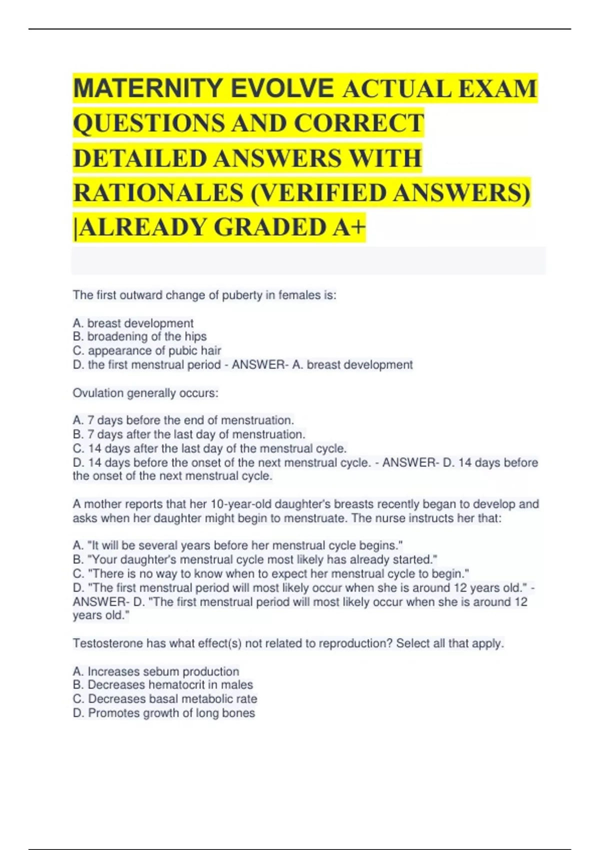 MATERNITY EVOLVE ACTUAL EXAM QUESTIONS AND CORRECT DETAILED ANSWERS WITH RATIONALES (VERIFIED ANSWERS) |ALREADY GRADED A+ The first outward change of puberty in females is: A. breast development B. broadening of the hips C. appearance of pubic hair D. the first menstrual period - ANSWER- A. breast development Ovulation generally occurs: A. 7 days before the end of menstruation. B. 7 days after the last day of menstruation. C. 14 days after the last day of the menstrual cycle. D. 14 days before the onset of the next menstrual cycle. - ANSWER- D. 14 days before the onset of the next menstrual cycle. A mother reports that her 10-year-old daughter's breasts recently began to develop and asks when her daughter might begin to menstruate. The nurse instructs her that: A. "It will be several years before her menstrual cycle begins." B. "Your daughter's menstrual cycle most likely has already started." C. "There is no way to know when to expect her menstrual cycle to begin." D. "The first menstrual period will most likely occur when she is around 12 years old." - ANSWER- D. "The first menstrual period will most likely occur when she is around 12 years old." Testosterone has what effect(s) not related to reproduction? Select all that apply. A. Increases sebum production B. Decreases hematocrit in males C. Decreases basal metabolic rate D. Promotes growth of long bones E. Increases muscle mass and strength - ANSWER- A. Increases sebum production D. Promotes growth of long bones E. Increases muscle mass and strength The tissue between the vaginal orifice and the anus is known as the ____________. - ANSWER- perineum The usual site of implantation is the: A. edge of the inner cervical os B. outer third of the fallopian (uterine) tube C. lower section of the posterior uterine wall D. upper section of the posterior uterine wall - ANSWER- D. upper section of the posterior uterine wall An expectant mother is at her first prenatal visit. She informs the nurse that she smokes cigarettes, but has cut back to approximately 10 cigarettes per week and asks if she could continue to do so. What would be the best response? A. "That is something you should ask the physician" B. "You should decrease the amount of cigarettes you smoke." C. "Occasional smoking is not proven to be harmful during pregnancy." D. "Factors such as smoking and alcohol use may adversely affect your baby's development." - ANSWER- D. "Factors such as smoking and alcohol use may adversely affect your baby's development." A pregnant woman having an ultrasound at 8 weeks of gestation asks the nurse if she could learn her expectant child's sex. The most accurate response would be: A. "Yes, we will be able to tell the sex of your child." B. "No, the sex organs have not yet started to develop." C. "We will have to wait until the birth of your child to know for sure." D. "The tenth week is when the external genitalia are visible on ultrasound." - ANSWER- D. "The tenth week is when the external genitalia are visible on ultrasound." What function(s) does the amniotic fluid have? Select all that apply. A. Allows buoyancy and fetal movement B. Nourishes the fetus C. Maintains an even temperature D. Allows for symmetrical growth E. Provides for fetal circulation - ANSWER- A. Allows buoyancy and fetal movement C. Maintains an even temperature D. Allows for symmetrical growth The fetal nervous system is formed by the germ layer known as the _____________. - ANSWER- ectoderm Which group of symptoms are abnormal changes during pregnancy? A. Constipation, nausea, cramping, weight gain B. Vaginal bleeding, blurred vision, and leaking of amniotic fluid C. Breast enlargement, headache, cramping, and urinary frequency D. Nasal stuffiness, increased vaginal discharge, and skin discoloration - ANSWER- B. Vaginal bleeding, blurred vision, and leaking of amniotic fluid At what time during pregnancy would patient education focus mainly on physiologic changes, fetal development, and sexuality during pregnancy, and nutrition? A. Before conception B. During the first trimester C. During the second trimester D. During the third trimester - ANSWER- B. During the first trimester Chloasma is an irregular hyperpigmentation of areas on the: A. chest, neck, arms, and legs B. breasts, areola, and nipples. C. cheeks, forehead, and nose. D. abdomen, breasts, and thighs- ANSWER- C. cheeks, forehead, and nose What are the positive signs of pregnancy? Select all that apply. A. Fetal heart activity B. Positive serum pregnancy test C. Fetal movements felt by mother D. Fetal outline identified by palpation E. Visualization of fetus with ultrasound - ANSWER- A. Fetal heart activity E. Visualization of fetus with ultrasound Varicosities of the rectum and anus that become more severe with constipation and with descent of the infant's head into the pelvis are called _____________________. - ANSWER- hemorrhoids Progression from preeclampsia to eclampsia is defined as: A. onset of diplopia and headache B. blood pressure of 150/100 mm Hg or above C. presence of facial edema and proteinuria D. One or more generalized tonic-clonic seizures. - ANSWER- D. one or more generalized tonic-clonic seizures. A patient is 28 weeks pregnant and has pregnancy-induced hypertension. Which symptom would indicate that her condition is worsening? A. Epigastria pain B. Dependent edema C. Feelings of lethargy D. Blood pressure of 138/90 mm Hg - ANSWER- A. Epigastria pain What is the best description of hemolytic disease of the fetus and newborn? A. An immune reaction of the fetus' blood against the blood group factor on the mother's red blood cells B. An immune reaction by the mother's blood against the blood group factor on the fetus' red blood cells C. Rh incompatibility disease that results in a hemoglobin value of 10 g or less in the fetus or newborn D. Rh disease that results in sickle cell disease in the fetus or newborn - ANSWER- B. An immune reaction by the mother's blood against the blood group factor on t