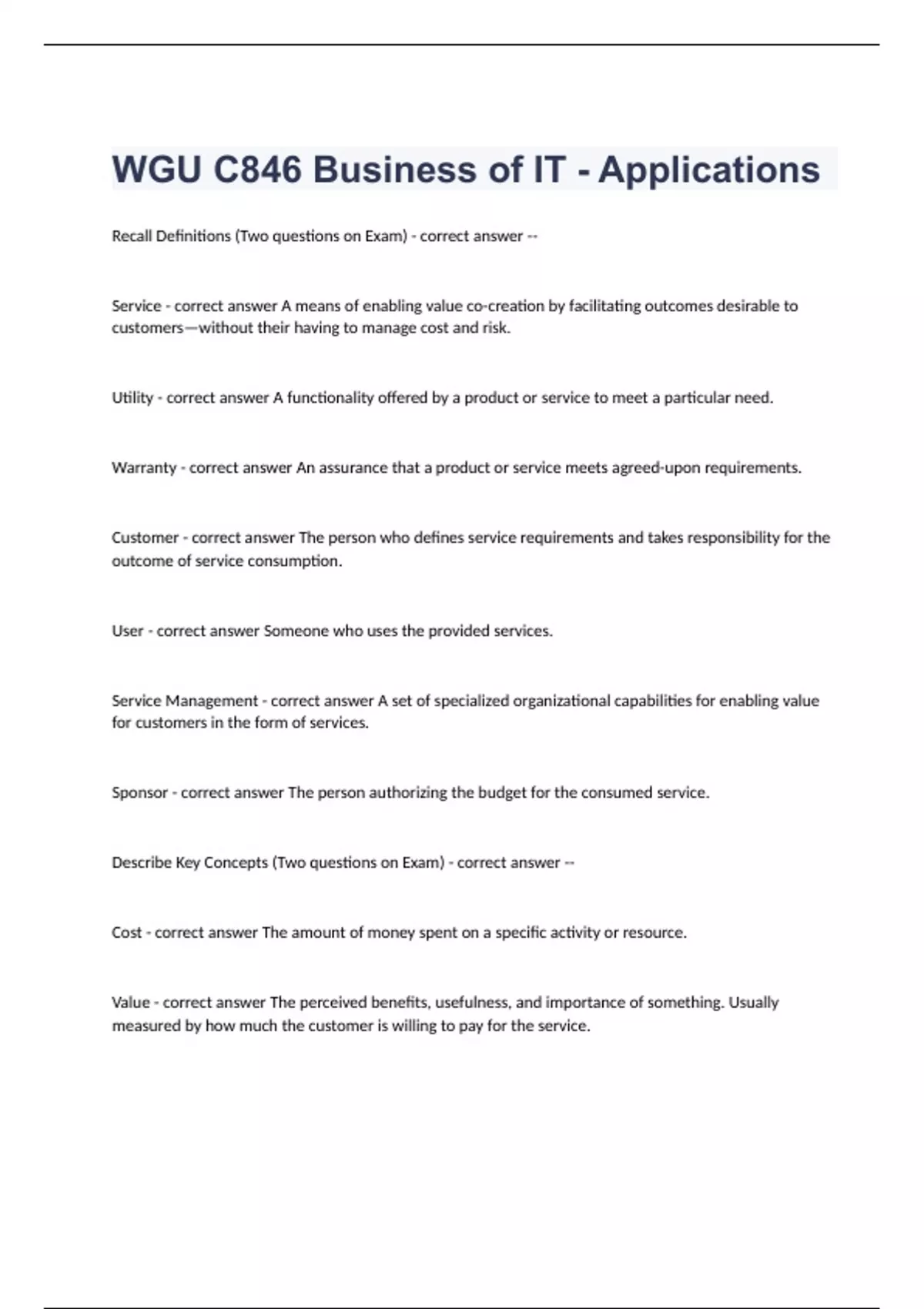 WGU C846 Business of IT - Applications.Recall Definitions (Two questions on Exam) - correct answer -- Service - correct answer A means of enabling value co-creation by facilitating outcomes desirable to customers—without their having to manage cost and risk. Utility - correct answer A functionality offered by a product or service to meet a particular need. Warranty - correct answer An assurance that a product or service meets agreed-upon requirements. Customer - correct answer The person who defines service requirements and takes responsibility for the outcome of service consumption. User - correct answer Someone who uses the provided services. Service Management - correct answer A set of specialized organizational capabilities for enabling value for customers in the form of services. Sponsor - correct answer The person authorizing the budget for the consumed service. Describe Key Concepts (Two questions on Exam) - correct answer -- Cost - correct answer The amount of money spent on a specific activity or resource. Value - correct answer The perceived benefits, usefulness, and importance of something. Usually measured by how much the customer is willing to pay for the service. Organization - correct answer A person or group with its internal functions, and with its own set of responsibilities, authorities, and relationships necessary to achieve its objectives. Outcome - correct answer A result as perceived by a stakeholder—that is enabled by one or more outputs. Output - correct answer A tangible or intangible deliverable of an activity. Risk - correct answer A possible event that could cause harm or loss, or make the achievement of objectives more difficult. Describe Concepts of Services (One question on Exam) - correct answer Service Offering - correct answer A formal description of one or more services designed to address the needs of its target consumer, and include goods, access to resources, and service actions. Service Relationship Management - correct answer Joint activities that the service provider and service consumer both engage in to ensure continued value co-creation, according to agreed-upon and available service offerings. Service Provision - correct answer Activites an organization engages in to provide services, such as possibly supplying goods, fulfillment of agreed-upon service actions, and ensuring user access to these resources. Service Consumption - correct answer Management of consumer resources necessary to use the service Describe the Nature, use and interaction of the Guiding Principles (One question on Exam) - correct answer -- ITIL Guiding Principles' Key Message - correct answer A guiding principle is a recommendation that guides an organization in all circumstances, regardless of changes in its goals strategies type of work or management structure. A guiding principle is universal and enduring.
