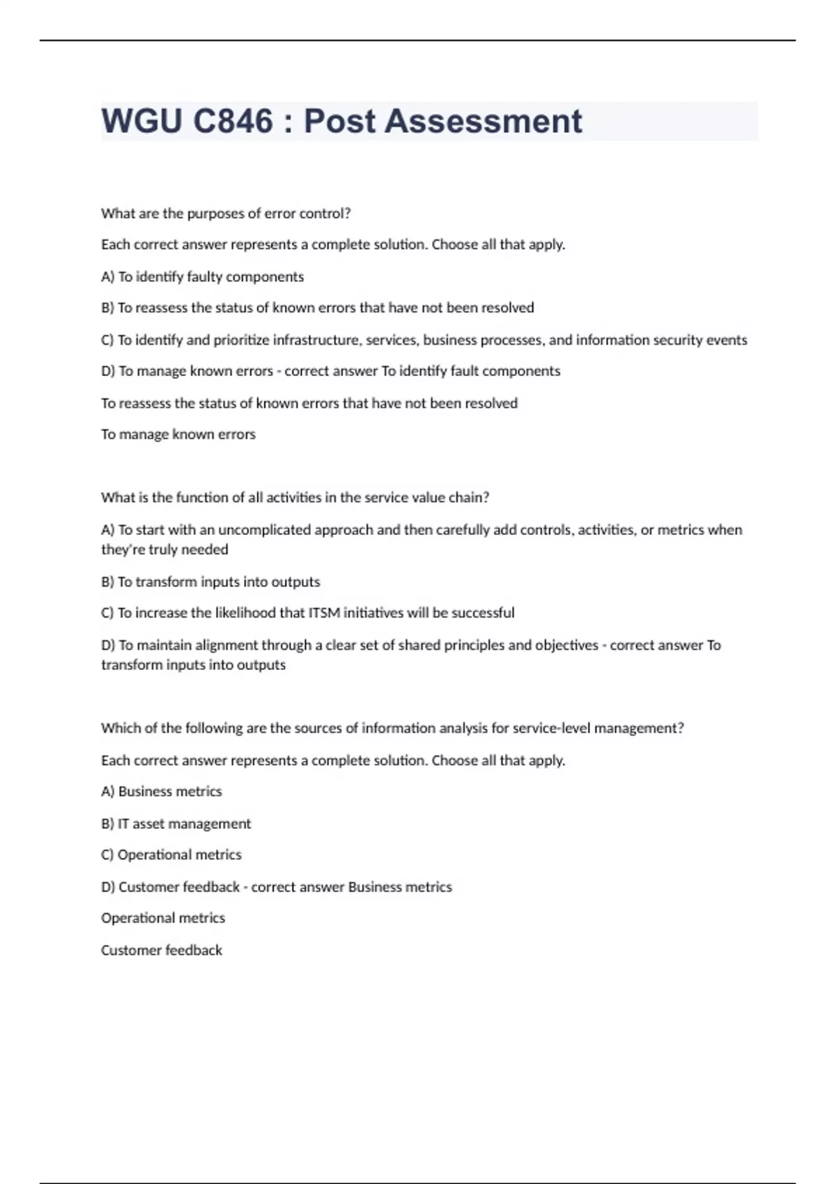 WGU C846 Post AssessmentWhat are the purposes of error control? Each correct answer represents a complete solution. Choose all that apply. A) To identify faulty components B) To reassess the status of known errors that have not been resolved C) To identify and prioritize infrastructure, services, business processes, and information security events D) To manage known errors - correct answer To identify fault components To reassess the status of known errors that have not been resolved To manage known errors What is the function of all activities in the service value chain? A) To start with an uncomplicated approach and then carefully add controls, activities, or metrics when they're truly needed B) To transform inputs into outputs C) To increase the likelihood that ITSM initiatives will be successful D) To maintain alignment through a clear set of shared principles and objectives - correct answer To transform inputs into outputs Which of the following are the sources of information analysis for service-level management? Each correct answer represents a complete solution. Choose all that apply. A) Business metrics B) IT asset management C) Operational metrics D) Customer feedback - correct answer Business metrics Operational metrics Customer feedback Which of the following are the customer-service skills required for service-desk personnel? Each correct answer represents a complete solution. Choose all that apply. A) Effective communication B) Emotional intelligence C) Incident analysis and prioritization D) Business liaison - correct answer Effective communication Emotional intelligence Incident analysis and prioritization Select the answer that best completes the following statement. Opportunity and demand trigger activities within the ITIL SVS that lead to: A) a shared culture throughout the organization. B) organizational silos. C) the creation of value. D) organizational agility and resilience. - correct answer the creation of value. Ensuring continual improvement of products, services, and practices across all value chain activities is the key purpose of what value chain activity? A) Deliver and support B) Obtain/build C) Design and transition D) Improve - correct answer Improve What is the definition of an event? A) Any financially valuable component that can contribute to the delivery of an IT product or service B) The external conditions that influence or affect something. C) An unplanned interruption to a service or reduction in the quality of service.