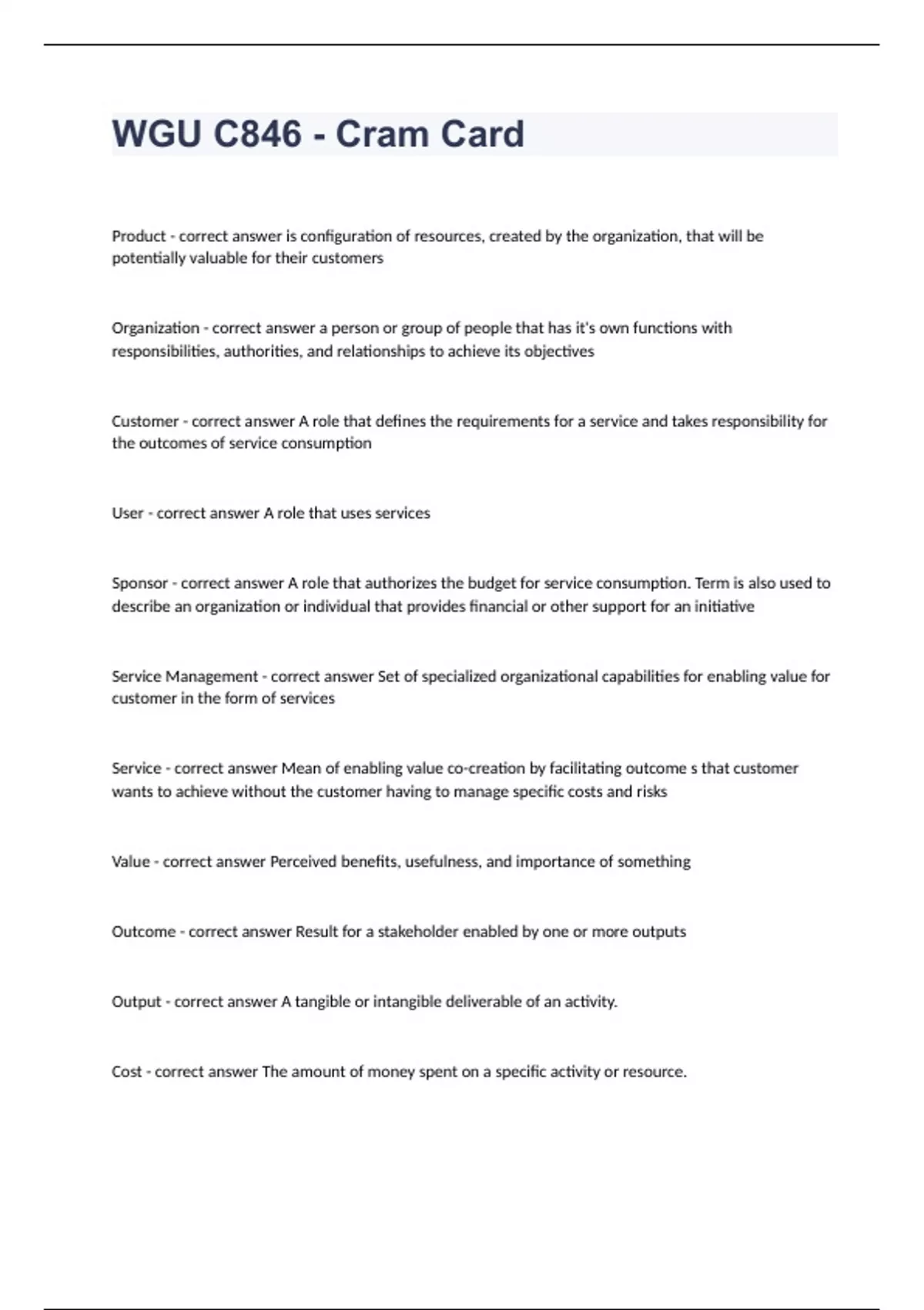 WGU C846 - Cram CardProduct - correct answer is configuration of resources, created by the organization, that will be potentially valuable for their customers Organization - correct answer a person or group of people that has it's own functions with responsibilities, authorities, and relationships to achieve its objectives Customer - correct answer A role that defines the requirements for a service and takes responsibility for the outcomes of service consumption User - correct answer A role that uses services Sponsor - correct answer A role that authorizes the budget for service consumption. Term is also used to describe an organization or individual that provides financial or other support for an initiative Service Management - correct answer Set of specialized organizational capabilities for enabling value for customer in the form of services Service - correct answer Mean of enabling value co-creation by facilitating outcome s that customer wants to achieve without the customer having to manage specific costs and risks Value - correct answer Perceived benefits, usefulness, and importance of something Outcome - correct answer Result for a stakeholder enabled by one or more outputs Output - correct answer A tangible or intangible deliverable of an activity. Cost - correct answer The amount of money spent on a specific activity or resource. Risk - correct answer Possible event that could cause harm or loss, or make or more difficult to achieve objectives (uncertainty of outcome) Goods - correct answer have ownership transferred to a consumer Access - correct answer Does not have the ownership transferred to a consumer Actions - correct answer performed by the provider to address a consumer need Service relationship management - correct answer Joint activities performed by a service provider and a service consumer to ensure continual value Co-creation based on agreed and available service offerings Service offering - correct answer a formal description of one or more services, designed to address the needs of a target consumer group. A service offering may include goods, access to resources, and service actions Service provision - correct answer activities performed by an organization to provide services, including management of the provider's resources, configured to deliver the service; ensuring access to these resources for users; fulfillment of the agreed service actions; service level management; and continual improvement. It may also include the supply of goods Service consumption - correct answer activities performed by an organization to consume services. It includes the management of the consumer's resources needed to use the service, service actions perform by users, and the receiving (acquiring) or goods (if required) Utility - correct answer is the functionality offered by a product or service to meet a particular need Utility - correct answer Fit for purpose Warranty - correct answer is the assurance that a product or service will meet agreed requirements