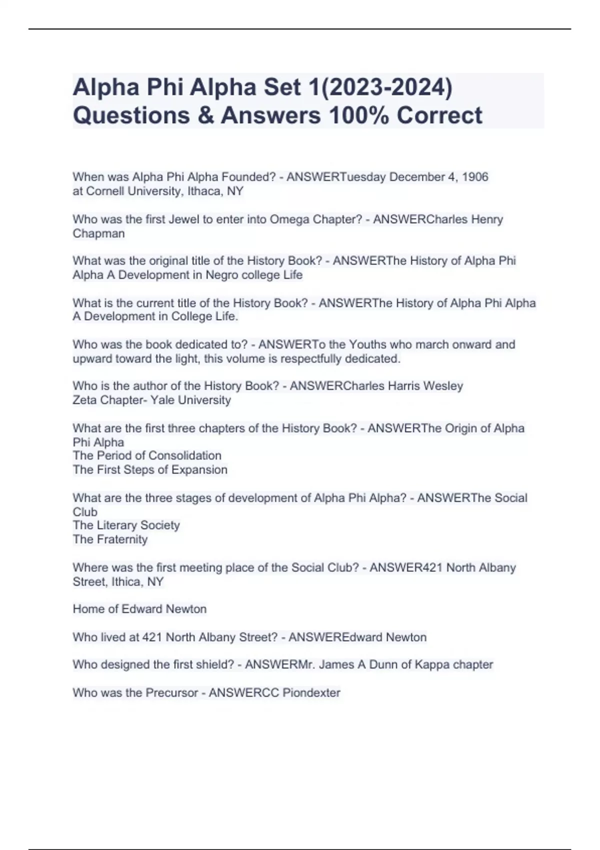 Alpha Phi Alpha Set 1() Questions & Answers 100% Correct Alpha Phi Alpha Set 1() Questions & Answers 100% Correct Alpha Phi Alpha Set 1() Questions & Answers 100% Correct Alpha Phi Alpha Set 1() Questions & Answers 100% Correct When was Alpha Phi Alpha Founded? - ANSWERTuesday December 4, 1906 at Cornell University, Ithaca, NY Who was the first Jewel to enter into Omega Chapter? - ANSWERCharles Henry Chapman What was the original title of the History Book? - ANSWERThe History of Alpha Phi Alpha A Development in Negro college Life What is the current title of the History Book? - ANSWERThe History of Alpha Phi Alpha A Development in College Life. Who was the book dedicated to? - ANSWERTo the Youths who march onward and upward toward the light, this volume is respectfully dedicated.