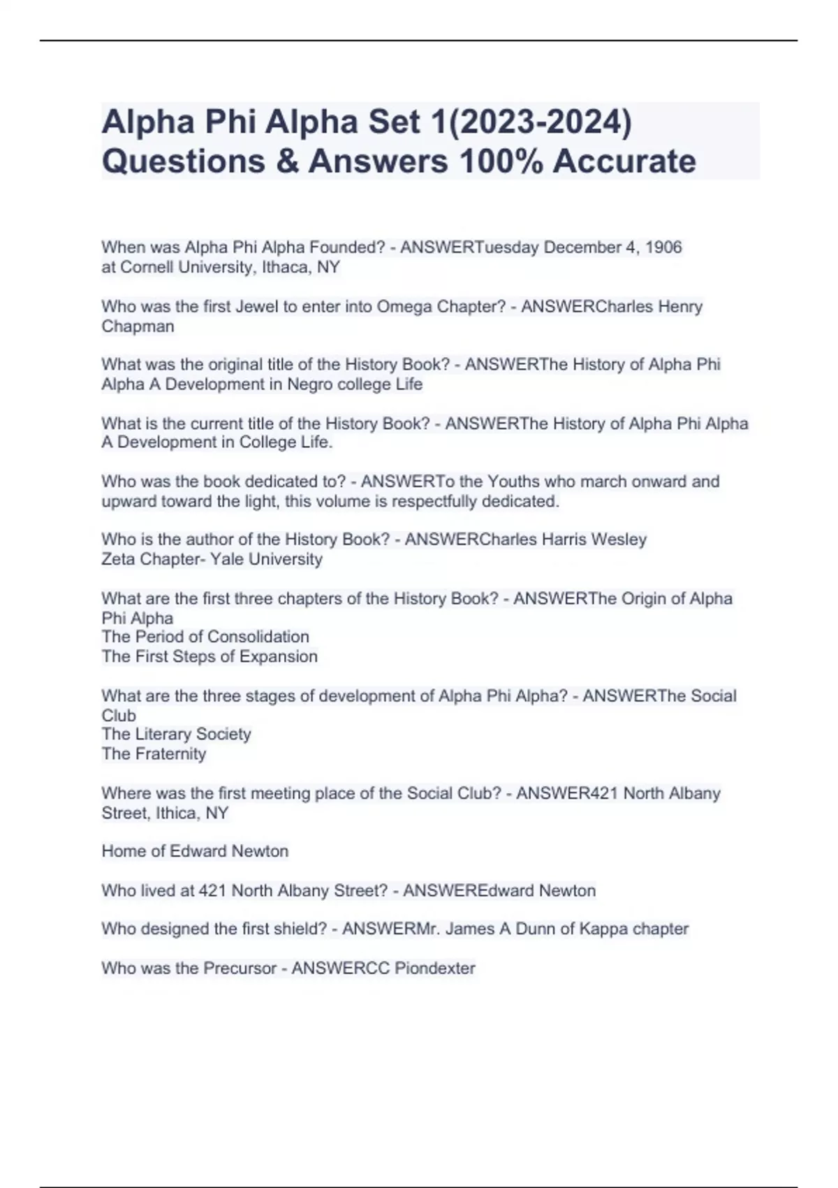 Alpha Phi Alpha Set 1() Questions & Answers 100% AccurateAlpha Phi Alpha Set 1() Questions & Answers 100% AccurateAlpha Phi Alpha Set 1() Questions & Answers 100% AccurateAlpha Phi Alpha Set 1() Questions & Answers 100% Accurate When was Alpha Phi Alpha Founded? - ANSWERTuesday December 4, 1906 at Cornell University, Ithaca, NY Who was the first Jewel to enter into Omega Chapter? - ANSWERCharles Henry Chapman What was the original title of the History Book? - ANSWERThe History of Alpha Phi Alpha A Development in Negro college Life What is the current title of the History Book? - ANSWERThe History of Alpha Phi Alpha A Development in College Life. Who was the book dedicated to? - ANSWERTo the Youths who march onward and upward toward the light, this volume is respectfully dedicated.