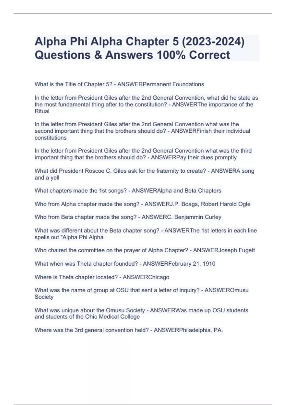 Alpha Phi Alpha Chapter 5 () Questions & Answers 100% CorrectAlpha Phi Alpha Chapter 5 () Questions & Answers 100% CorrectAlpha Phi Alpha Chapter 5 () Questions & Answers 100% CorrectAlpha Phi Alpha Chapter 5 () Questions & Answers 100% CorrectWhat is the Title of Chapter 5? - ANSWERPermanent Foundations In the letter from President Giles after the 2nd General Convention, what did he state as the most fundamental thing after to the constitution? - ANSWERThe importance of the Ritual In the letter from President Giles after the 2nd General Convention what was the second important thing that the brothers should do? - ANSWERFinish their individual constitutions