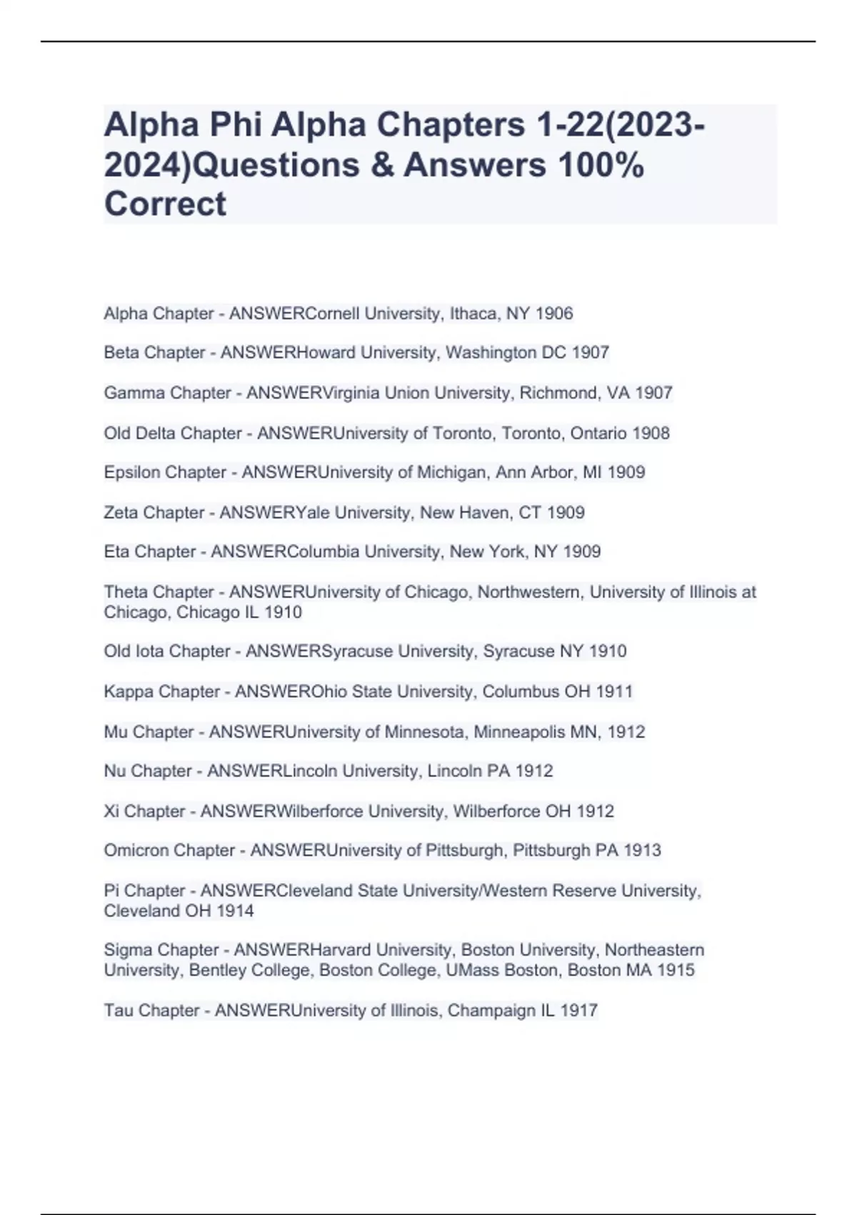 Alpha Phi Alpha Chapters 1-22()Questions & Answers 100% CorrectAlpha Phi Alpha Chapters 1-22()Questions & Answers 100% CorrectAlpha Phi Alpha Chapters 1-22()Questions & Answers 100% CorrectAlpha Chapter - ANSWERCornell University, Ithaca, NY 1906 Beta Chapter - ANSWERHoward University, Washington DC 1907 Gamma Chapter - ANSWERVirginia Union University, Richmond, VA 1907 Old Delta Chapter - ANSWERUniversity of Toronto, Toronto, Ontario 1908