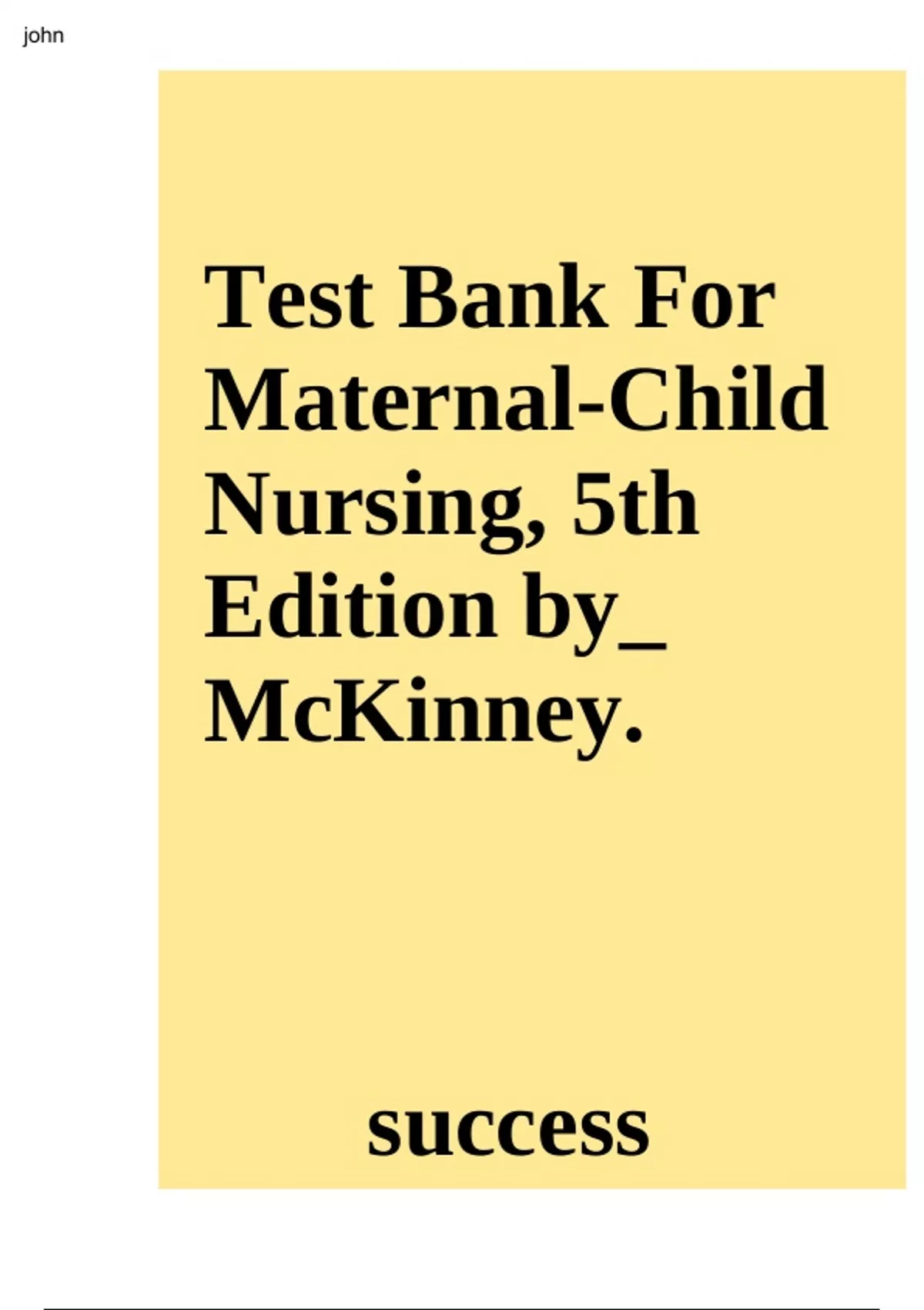 Test Bank For Maternal-Child Nursing 5th Edition By McKinney 9780323697880 Chapter 1-55 Complete Questions And Answers A+ Get ready for your exams with the "Test Bank for Maternal-Child Nursing 5th Edition by McKinney, James, Murray, Nelson, & Ashwill." Access all questions and answers from chapters 1-55 in a printable PDF format. Delivered instantly, straight from the publisher. Simple, comprehensive, and tailored for nursing students like you. Prepare confidently and ace your exams!
