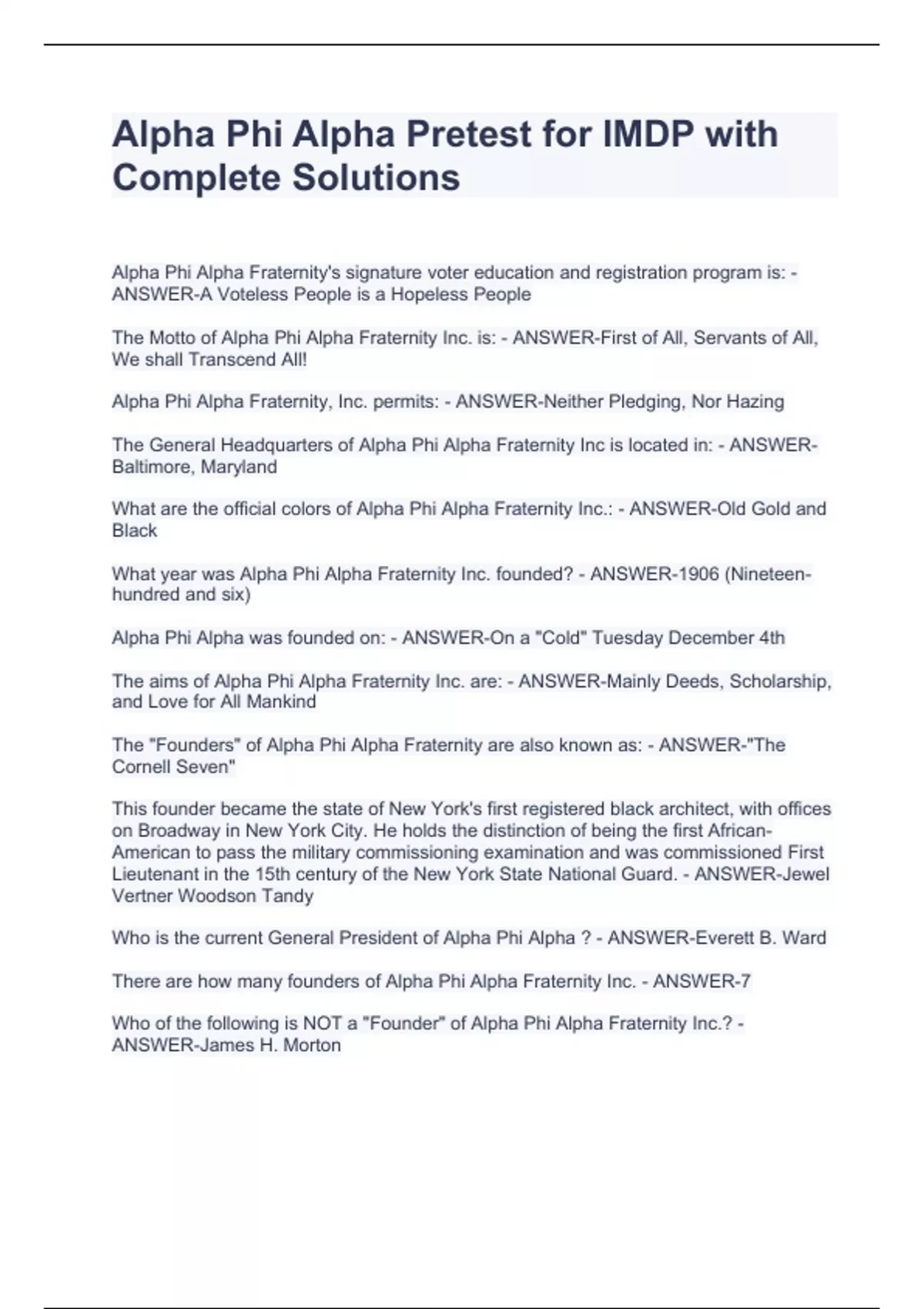 Alpha Phi Alpha Pretest for IMDP with Complete Solutions Alpha Phi Alpha Pretest for IMDP with Complete Solutions Alpha Phi Alpha Pretest for IMDP with Complete Solutions Alpha Phi Alpha Pretest for IMDP with Complete Solutions Alpha Phi Alpha Fraternity's signature voter education and registration program is: - ANSWER-A Voteless People is a Hopeless People The Motto of Alpha Phi Alpha Fraternity Inc. is: - ANSWER-First of All, Servants of All, We shall Transcend All!