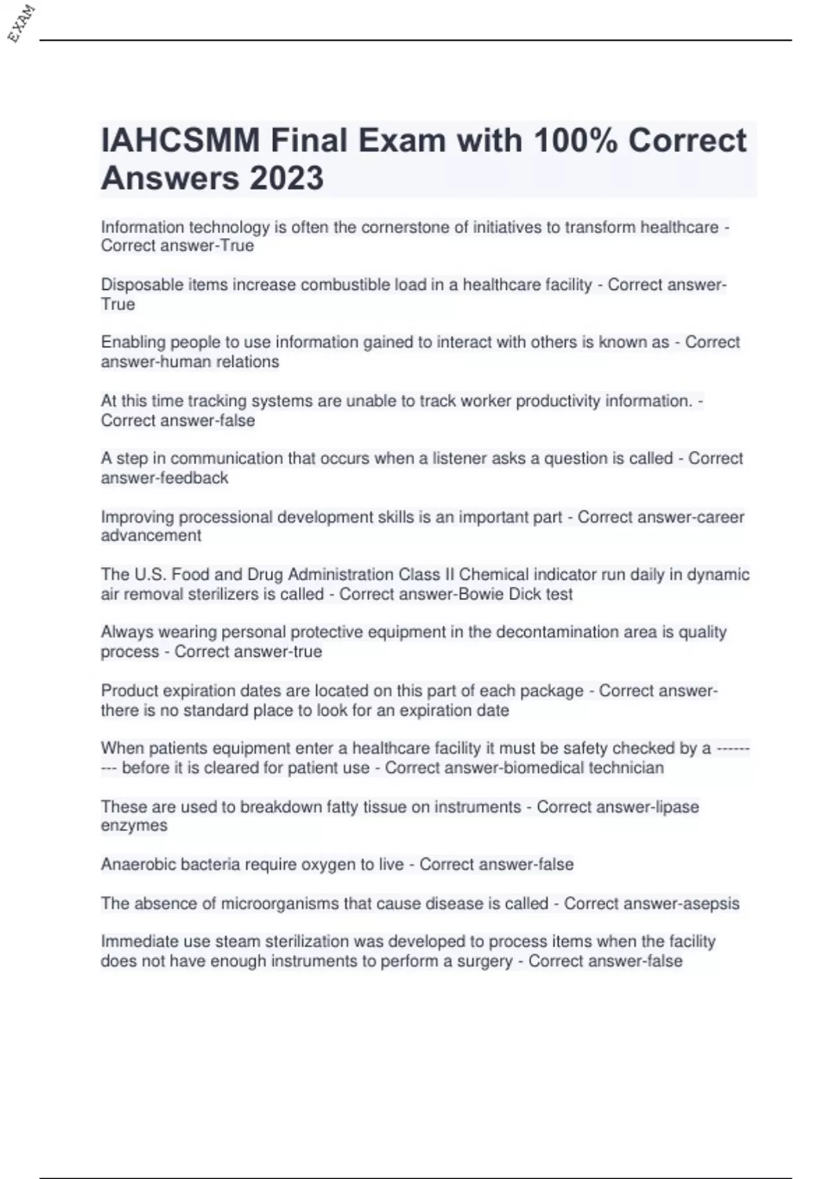 IAHCSMM Final Exam with 100% Correct Answers