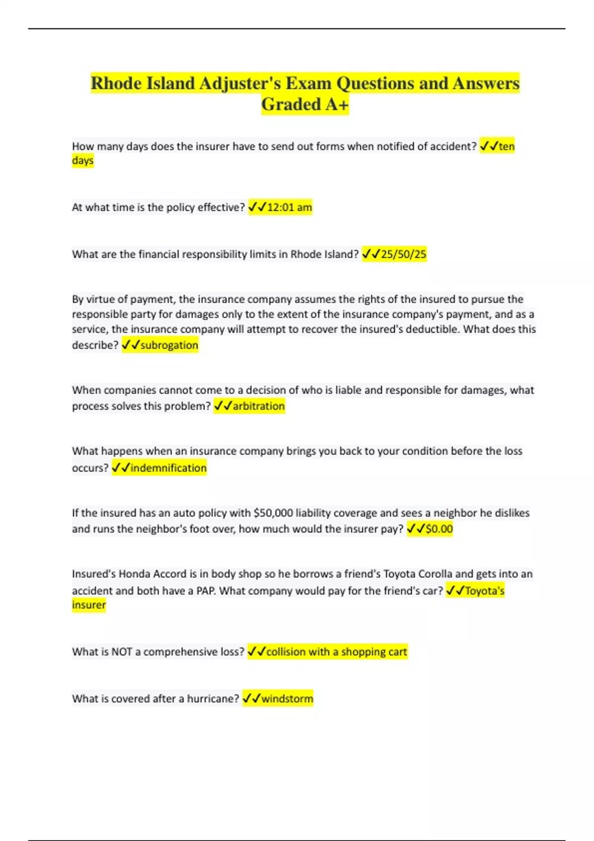 Rhode Island Adjuster's Exam Questions and Answers Graded A+