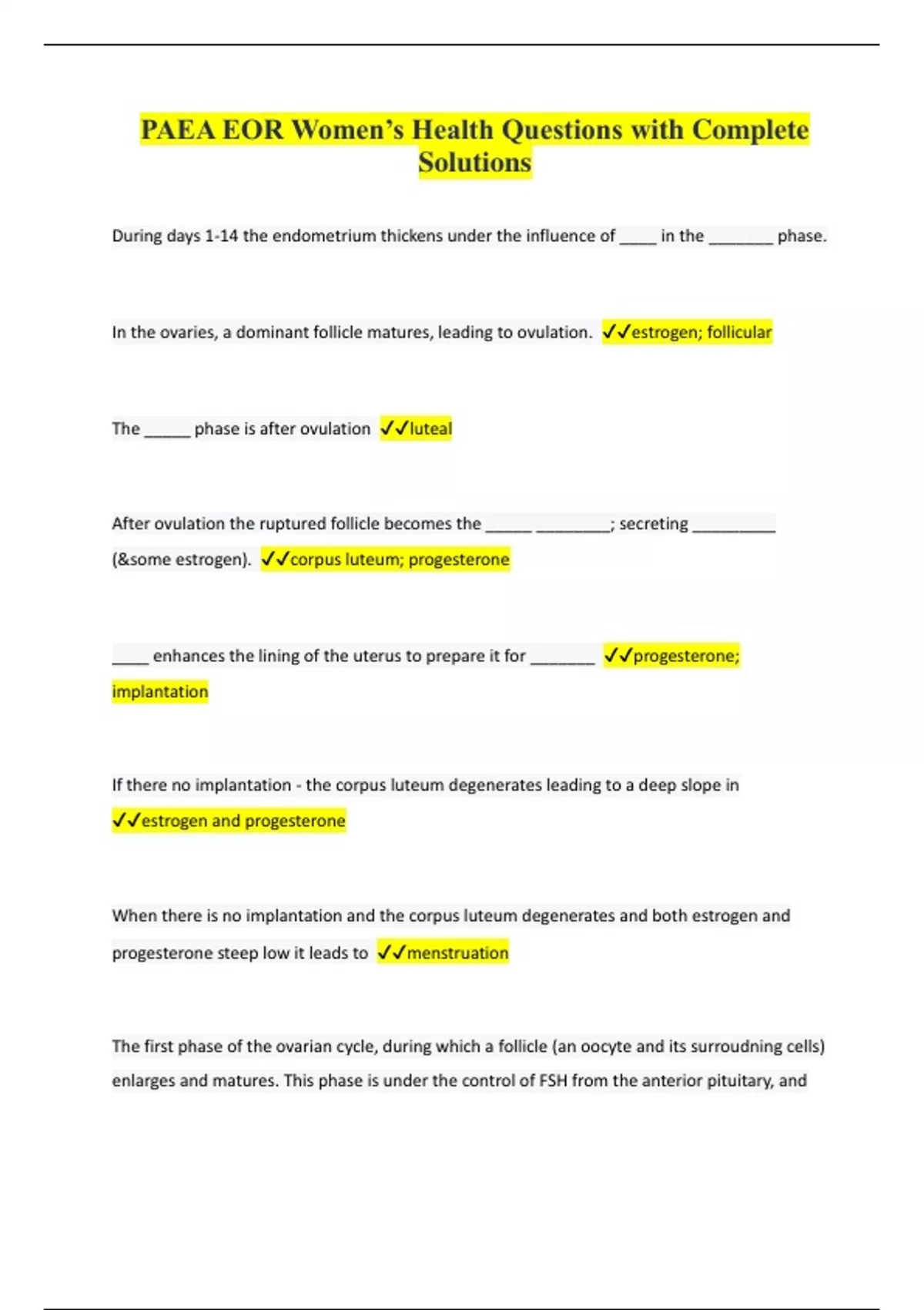 PAEA EOR Women’s Health Questions with Complete Solutions