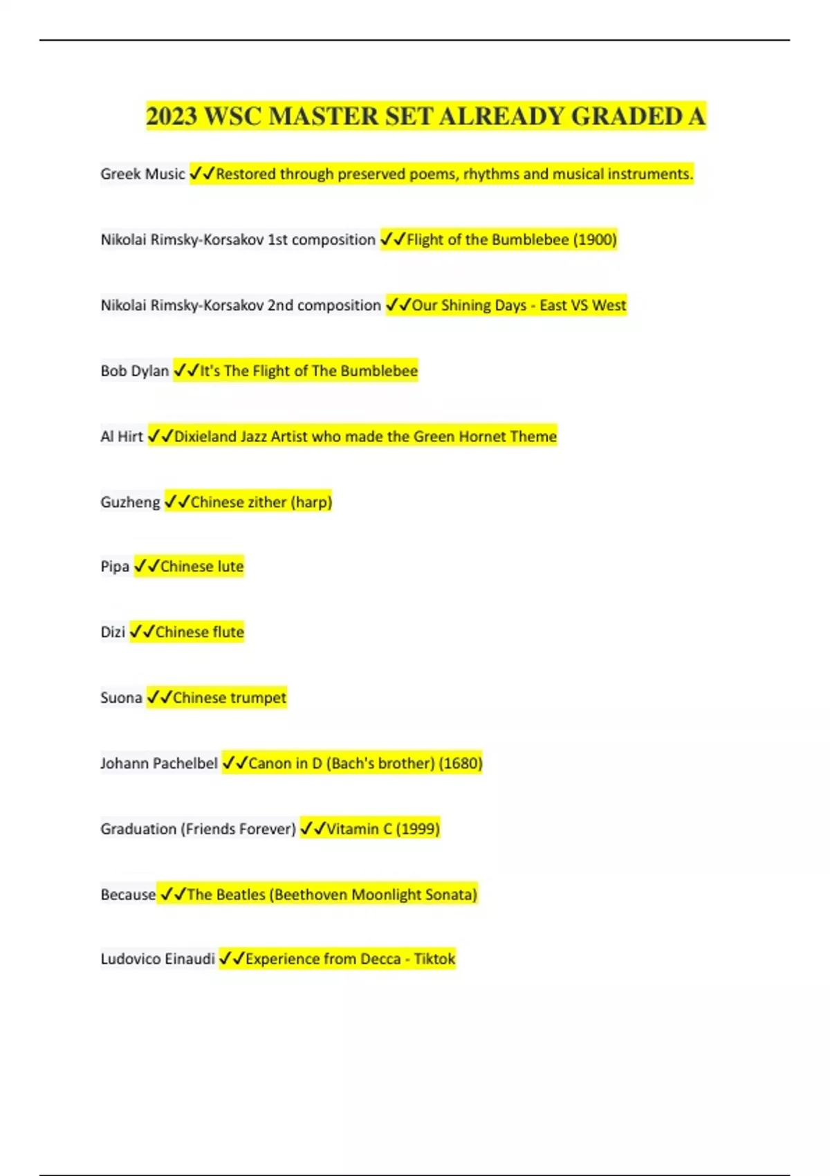 Greek Music Restored through preserved poems, rhythms and musical instruments. Nikolai Rimsky-Korsakov 1st composition Flight of the Bumblebee (1900) Nikolai Rimsky-Korsakov 2nd composition Our Shining Days - East VS West Bob Dylan It's The Flight of The Bumblebee Al Hirt Dixieland Jazz Artist who made the Green Hornet Theme Guzheng Chinese zither (harp) Pipa Chinese lute Dizi Chinese flute Suona Chinese trumpet Johann Pachelbel Canon in D (Bach's brother) (1680) Graduation (Friends Forever) Vitamin C (1999)