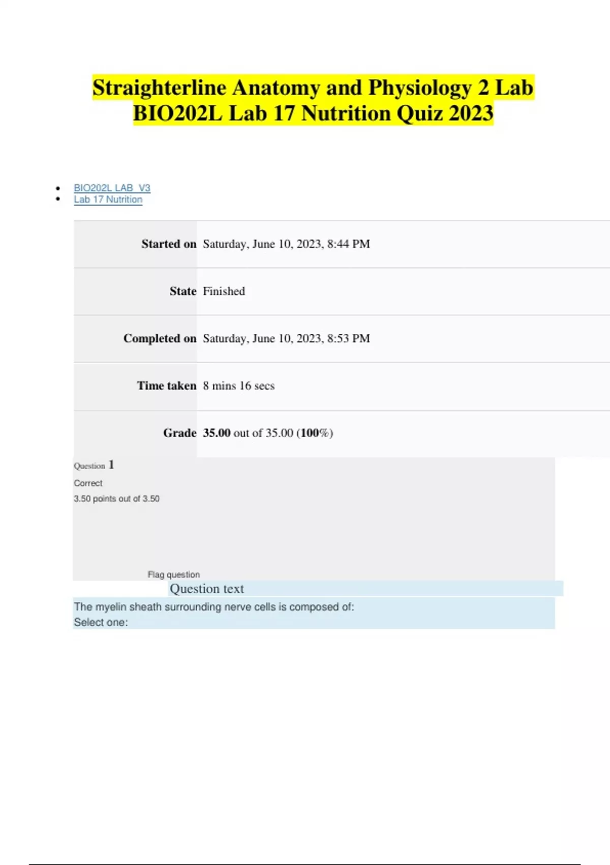 Straighterline Anatomy and Physiology 2 Lab BIO202L Lab 17 Nutrition Quiz 2023