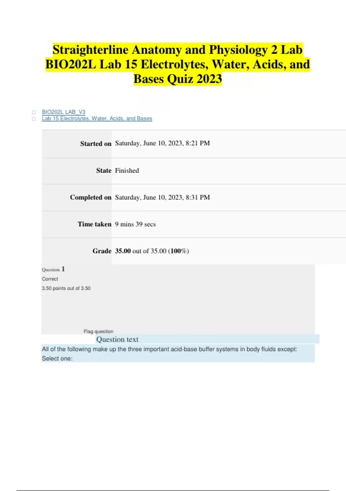 Straighterline Anatomy and Physiology 2 Lab BIO202L Lab 15 Electrolytes, Water, Acids, and Bases Quiz 2023