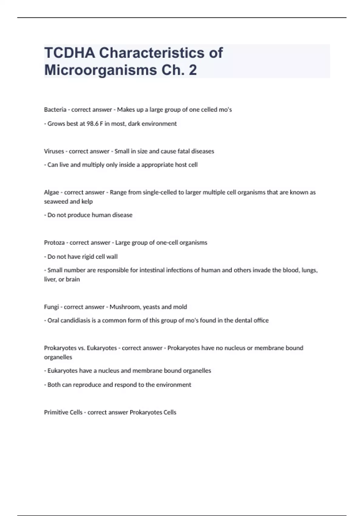 TCDHA Characteristics of Microorganisms Ch. 2Bacteria - correct answer - Makes up a large group of one celled mo's - Grows best at 98.6 F in most, dark environment Viruses - correct answer - Small in size and cause fatal diseases - Can live and multiply only inside a appropriate host cell Algae - correct answer - Range from single-celled to larger multiple cell organisms that are known as seaweed and kelp - Do not produce human disease Protoza - correct answer - Large group of one-cell organisms - Do not have rigid cell wall - Small number are responsible for intestinal infections of human and others invade the blood, lungs, liver, or brain Fungi - correct answer - Mushroom, yeasts and mold - Oral candidiasis is a common form of this group of mo's found in the dental office Prokaryotes vs. Eukaryotes - correct answer - Prokaryotes have no nucleus or membrane bound organelles - Eukaryotes have a nucleus and membrane bound organelles - Both can reproduce and respond to the environment Primitive Cells - correct answer Prokaryotes Cells Complex Cells - correct answer Eukaryote Cells What are some features Prokaryotic cells don't have? - correct answer I) Cell wall II) Cilia III) ER IV) Vacuoles & Vesicles V) Mitochondria VI) Chloroplasts VII) Golgi Complex VIII) Lysosomes IX) Nucleus Endospores - correct answer - Thick wall-walled structure; one of the most resistant forms of life against heat, drying and chemicals - Defence mechanism/protection against adverse conditions - EXTREMELY HARD TO KILL Mesosomes - correct answer Cell membrane folds up into cytoplasm and increases the internal surface area for membrane function. What are three basic shapes of cells? - correct answer Cocci (spherical), Spiral, and Bacillus (rod-shaped) Bacterial Growth - correct answer Increase in number of cells Binary Fission - correct answer The cells divide by this process What are the five major chemical or physical conditions influence growth of bacteria? - correct answer I) Temperature II) Acidity (pH of 5.5-8.5, optimal growth @ pH 7.0) III) Nutrients IV) Oxygen metabolism