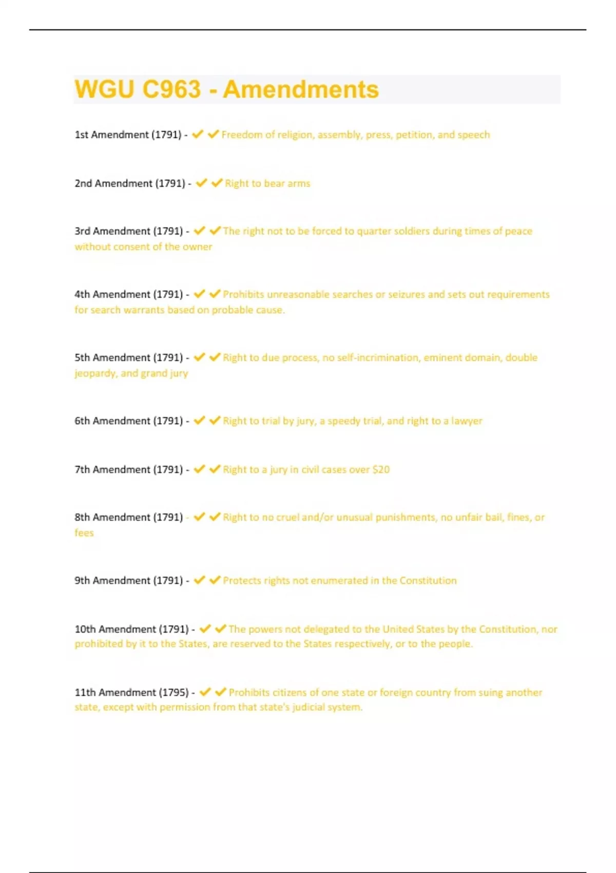 1st Amendment (1791) -Freedom of religion, assembly, press, petition, and speech 2nd Amendment (1791) - Right to bear arms 3rd Amendment (1791) - The right not to be forced to quarter soldiers during times of peace without consent of the owner 4th Amendment (1791) - Prohibits unreasonable searches or seizures and sets out requirements for search warrants based on probable cause. 5th Amendment (1791) - Right to due process, no self-incrimination, eminent domain, double jeopardy, and grand jury 6th Amendment (1791) - Right to trial by jury, a speedy trial, and right to a lawyer 7th Amendment (1791) - Right to a jury in civil cases over $20 8th Amendment (1791) - Right to no cruel and/or unusual punishments, no unfair bail, fines, or fees 9th Amendment (1791) - Protects rights not enumerated in the Constitution 10th Amendment (1791) - The powers not delegated to the United States by the Constitution, nor prohibited by it to the States, are reserved to the States respectively, or to the people. 11th Amendment (1795) - Prohibits citizens of one state or foreign country from suing another state, except with permission from that state's judicial system.12th Amendment (1804) - Electoral college must have two separate elections for the president and vice president.