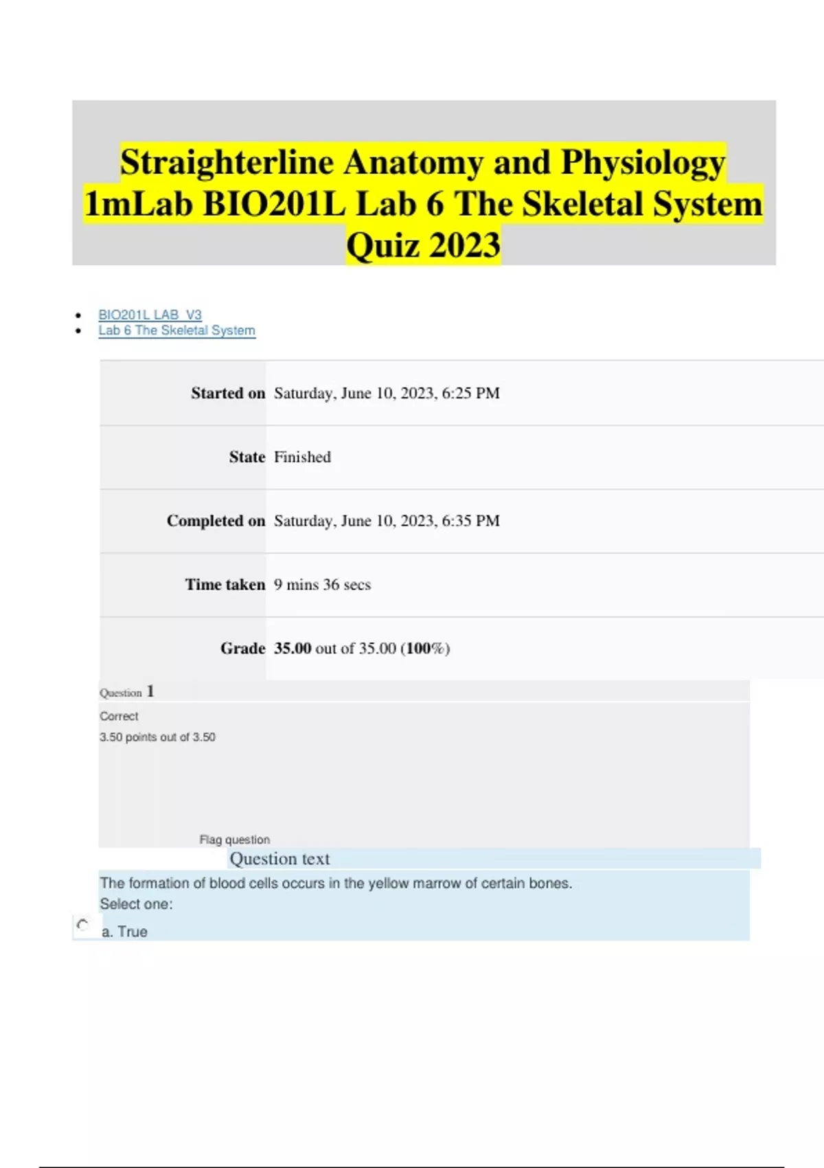 Straight erline Anatomy and Physiology 1mLab BIO201L Lab 6 The Skeletal System Quiz 2023 BIO201L LAB_V3 Lab 6 The Skeletal System Started on Saturday, June 10, 2023, 6:25 PM State Finished Completed on Saturday, June 10, 2023, 6:35 PM Time taken 9 mins 36 secs Grade 35.00 out of 35.00 ( 100%) Question 1 Correct 3.50 points out of 3.50 Flag question Question text The formation of blood cells occurs in the yellow marrow of certain bones. Select one: a. True b. False Question 2 Corre ct 3.50 points out of 3.50 Flag question Question text Fibrocartilage is primarily found on the ends of ribs and on the tracheA. Select one: a. True b. False Question 3 Correct 3.50 points out of 3.50 Flag question Question text Bones undergo a continual process of remodeling until the end of adolescence. After adolescence, there is no bone remodeling. Select one: a. True b. False Question 4 Correct 3.50 points out of 3.50 Flag quest ion Question text The carpals are an example of: Select one: