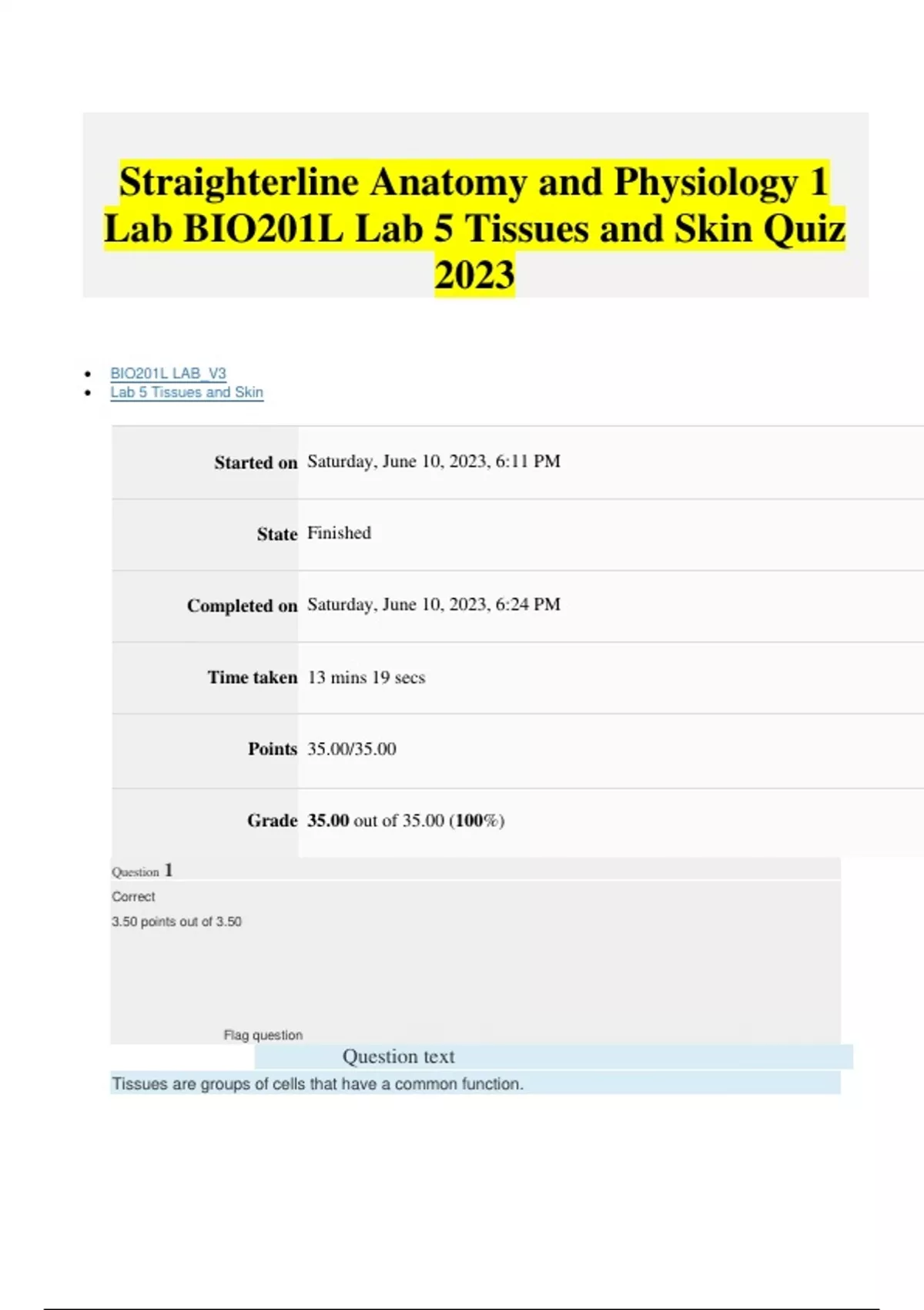 Straighterline Anatomy and Physiology 1 Lab BIO201L Lab 5 Tissues and Skin Quiz 2023